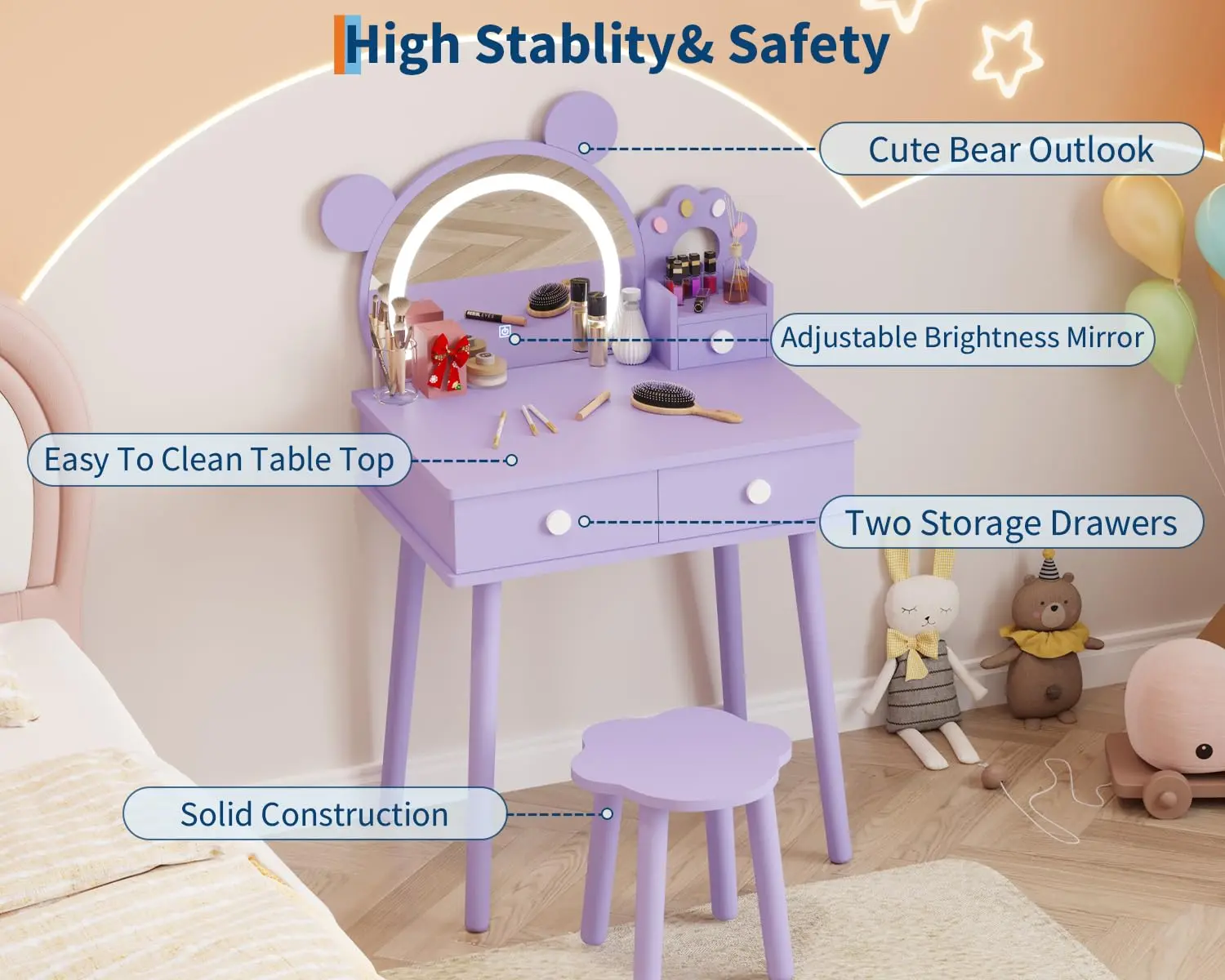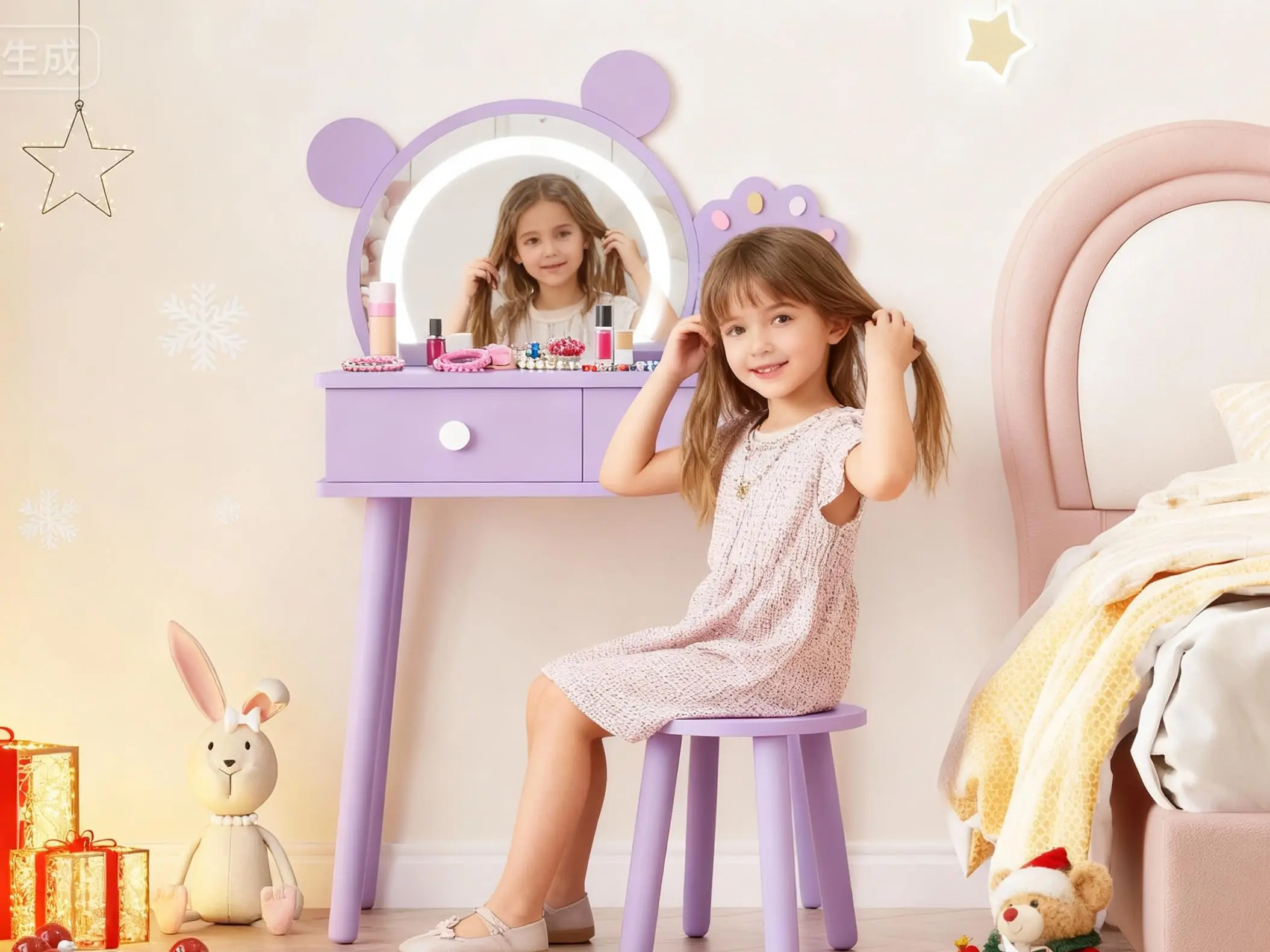 · ❤️【Charming Bear Vanity Set with Flower Stool】This enchanting kids vanity set features a bear-shaped mirror with paw accents and a flower-shaped stool. It’s ideal for little girls to enjoy pretend princess play, making an excellent birthday or holiday gift that encourages creativity and imaginative fun.