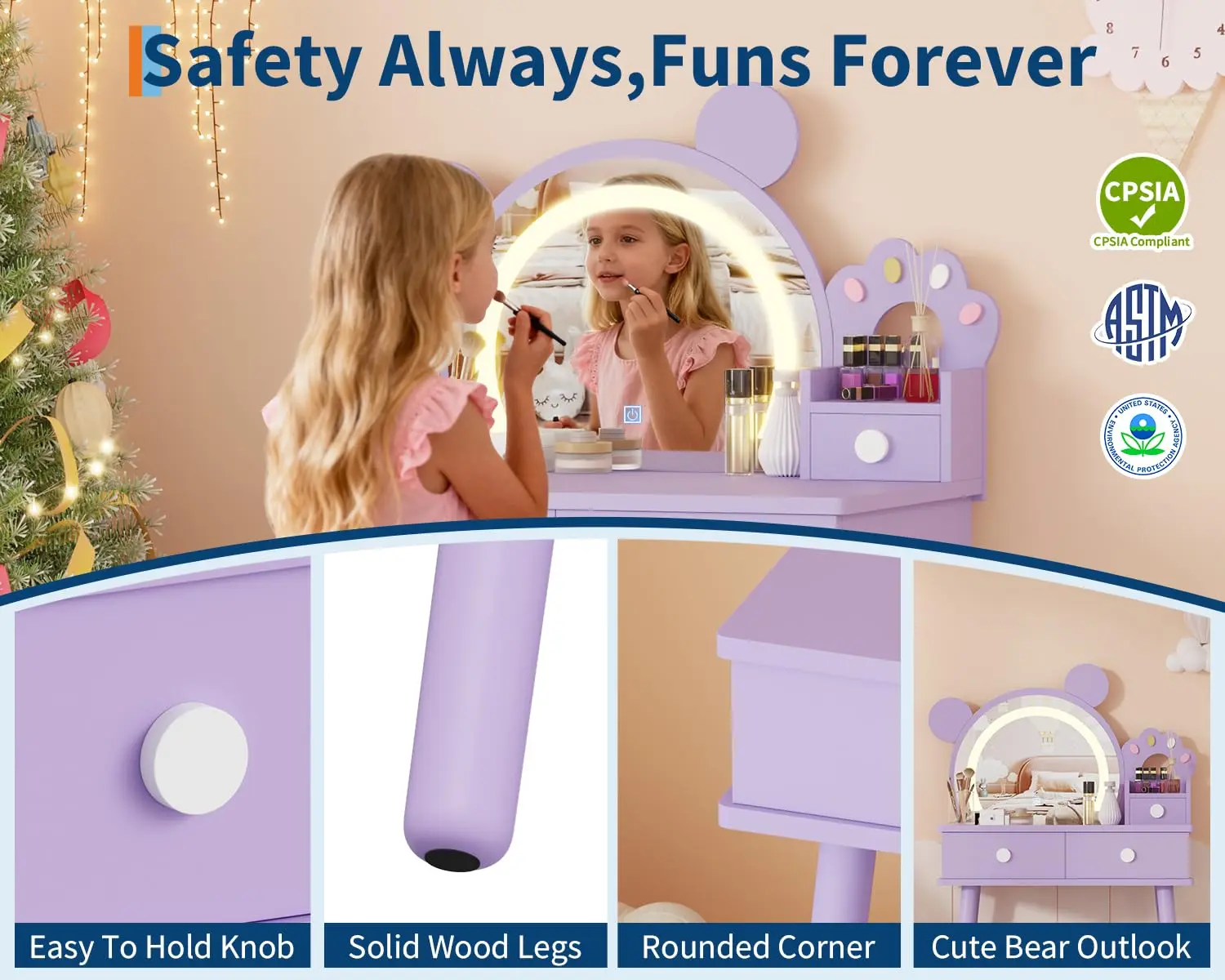 · ❤️【Adjustable 3-Color LED Touch-Control Mirror】The bear-shaped mirror includes three LED light colors that your child can easily switch by touch. The soft, mood-matching lighting enhances makeup play or hair styling while protecting young eyes from harsh glare.