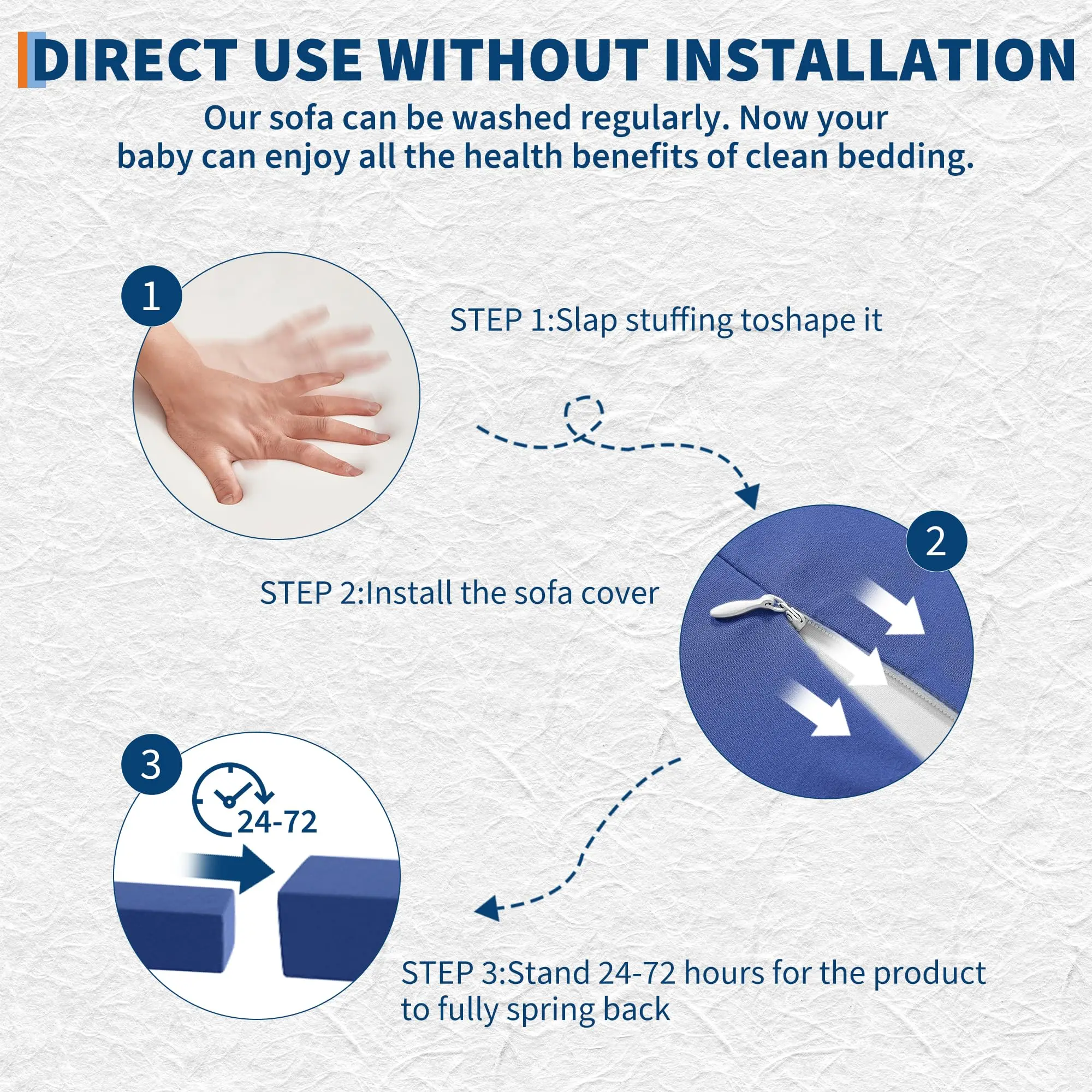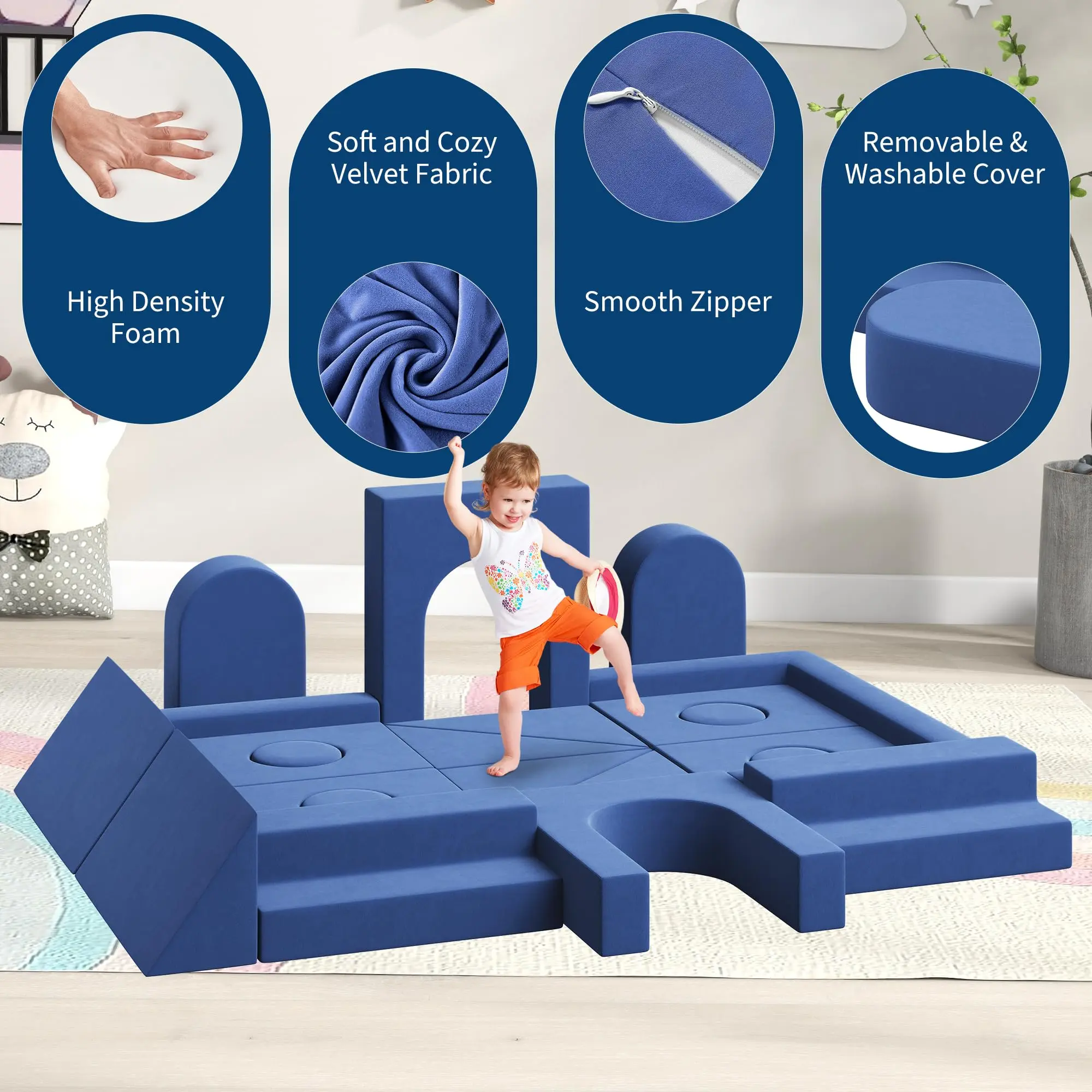 · Easy-to-Clean: The play foam couch is CertiPUR-US certified and tested to be free of any harmful substances, ensuring a soft, safe surface for jumping, climbing. The removable velvet sofa covers are fully machine-washable, designed to stay soft and vibrant with minimal care. Reinforced stitching guarantees long-lasting durability during energetic play.