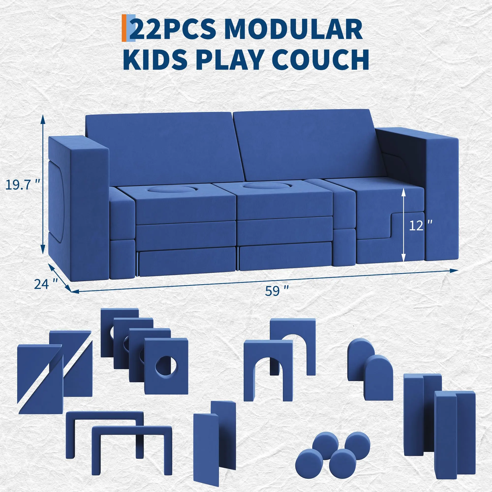 · 2-Seat Sofa Design: Measuring 59"LX 24" WX19.7"H , this spacious kids couch comfortably seats two children up to 12 years old. The complete set includes 4 arches, 4 triangles, 4 circles, 2 trapezoid corner pillars, 2 half-circles, and 4 hollow rectangles, giving kids a full collection of shapes for building, climbing, and imaginative play.