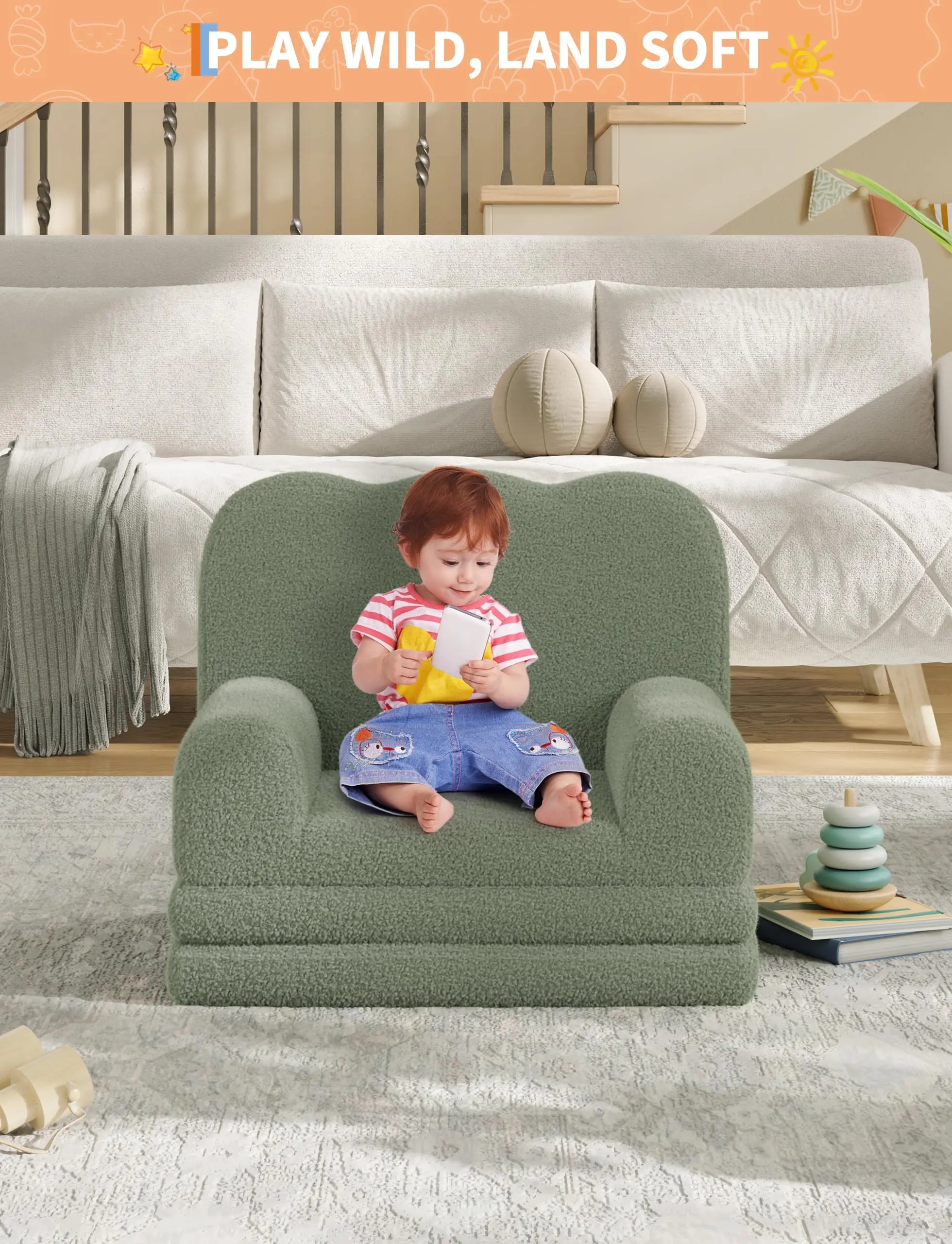 · Convertible 2-in-1 Toddler Sofa: The children's sofa easily transforms from a comfortable armchair into a lounge chair. Ideal for reading, playing, or relaxing, it meets your child's daily needs, whether sitting upright or lying down for a nap.