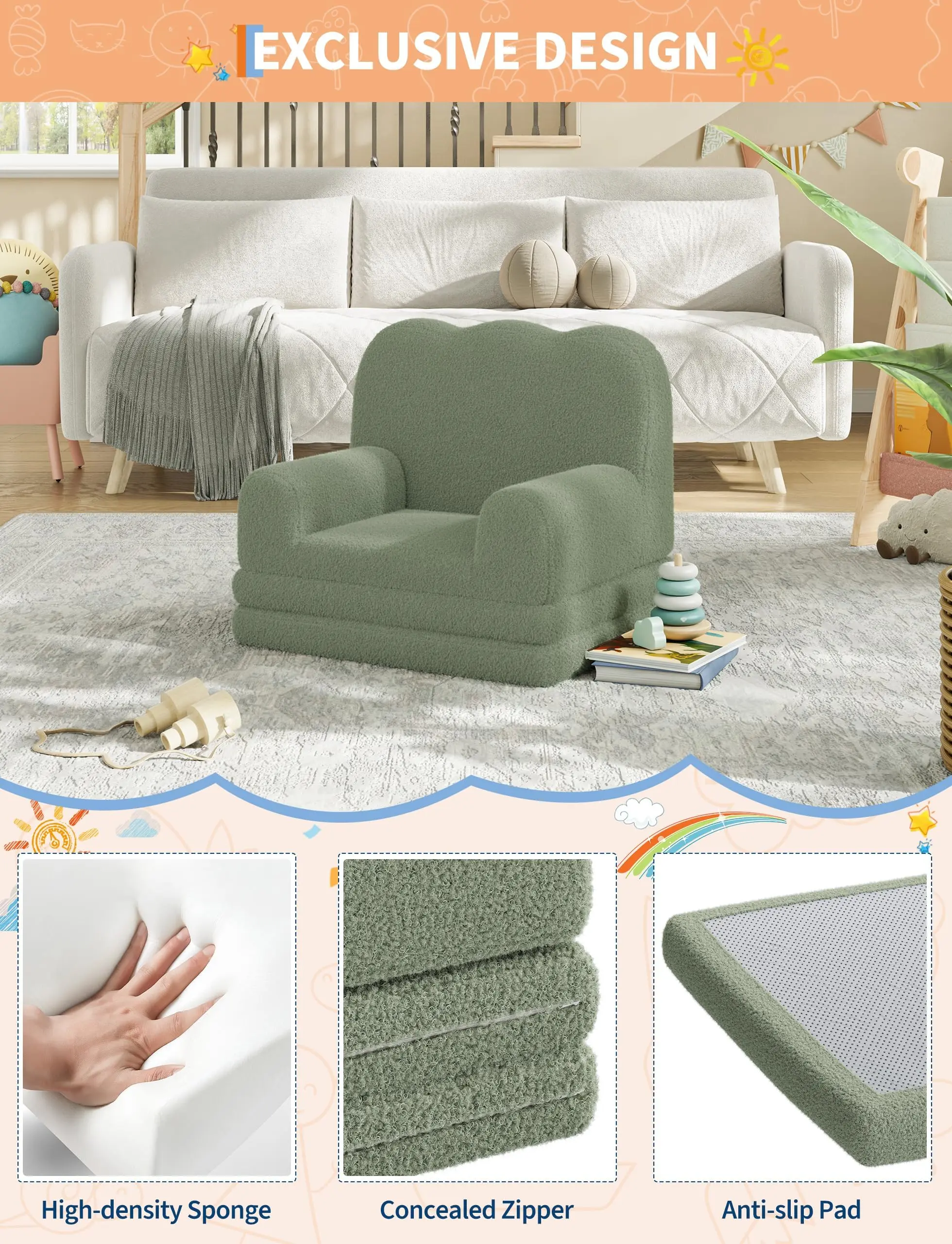 · Thoughtful Design for Kids: Equipped with hidden zippers to prevent little ones from handling or swallowing parts, and a non-slip bottom to keep the sofa in place, this sofa is designed with your child's safety in mind.