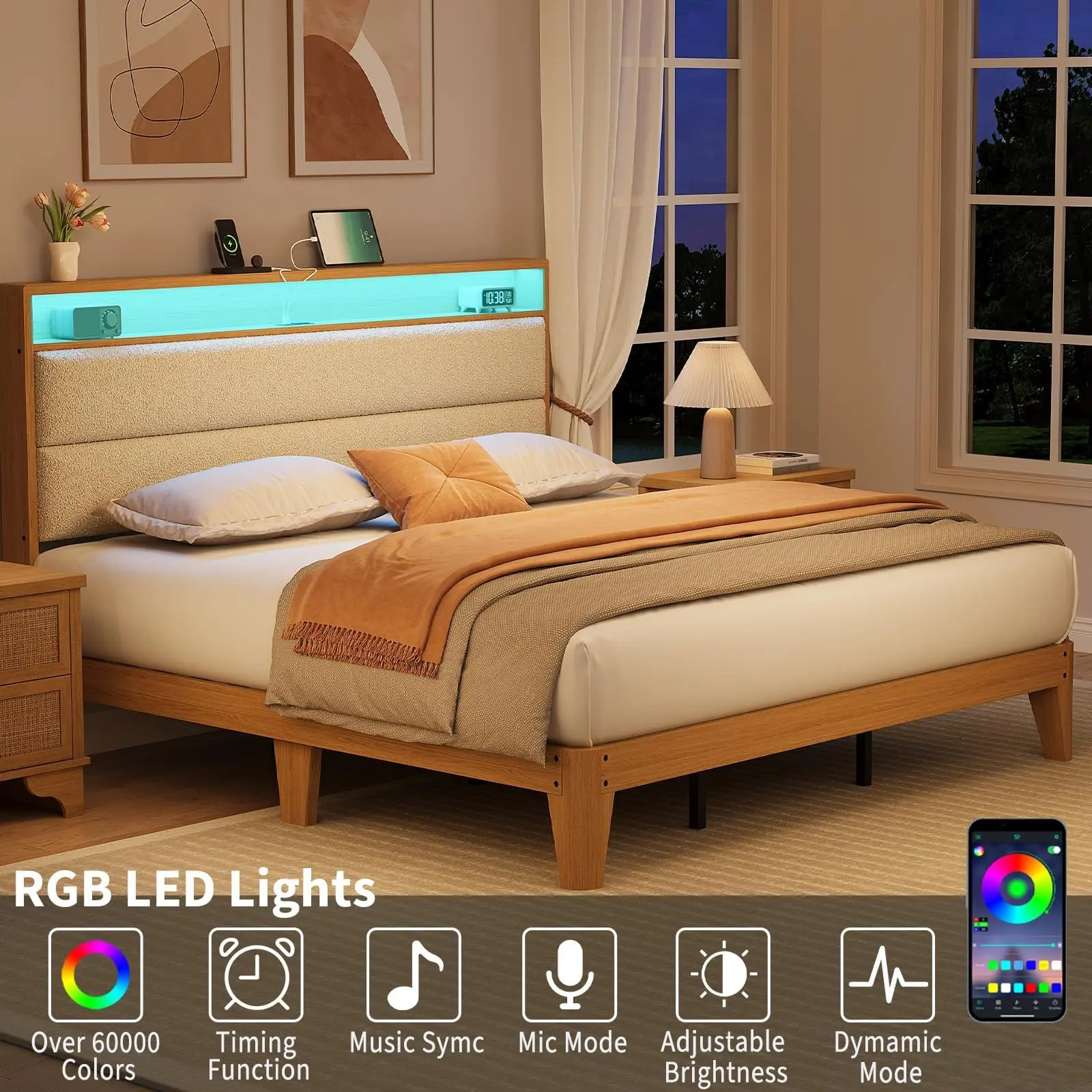 · SMART RGB LED LIGHT: The upholstered bed frame is equipped with APP-controlled smart LED light with multiple RGB colors, you can freely set the color, brightness, mode and timer function
