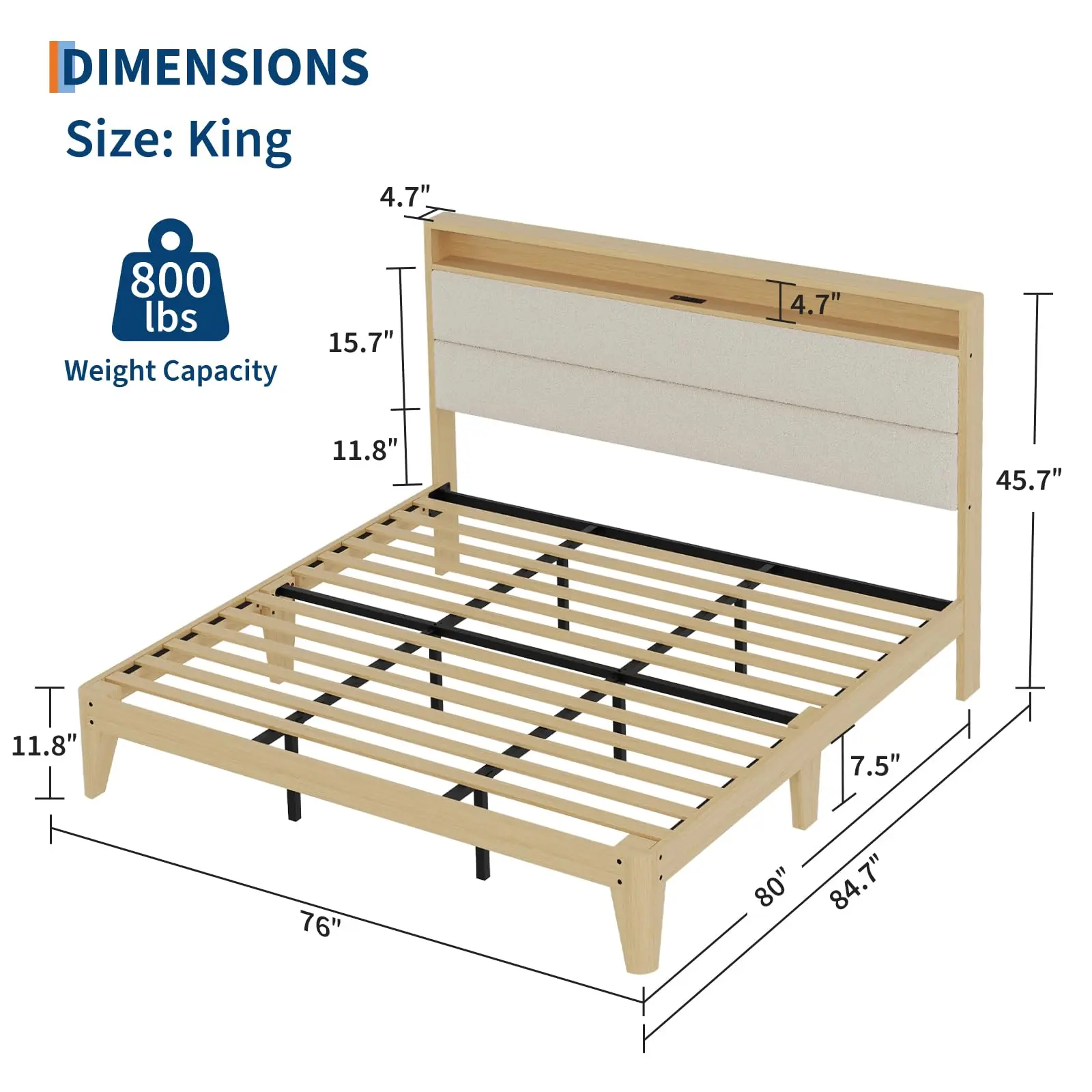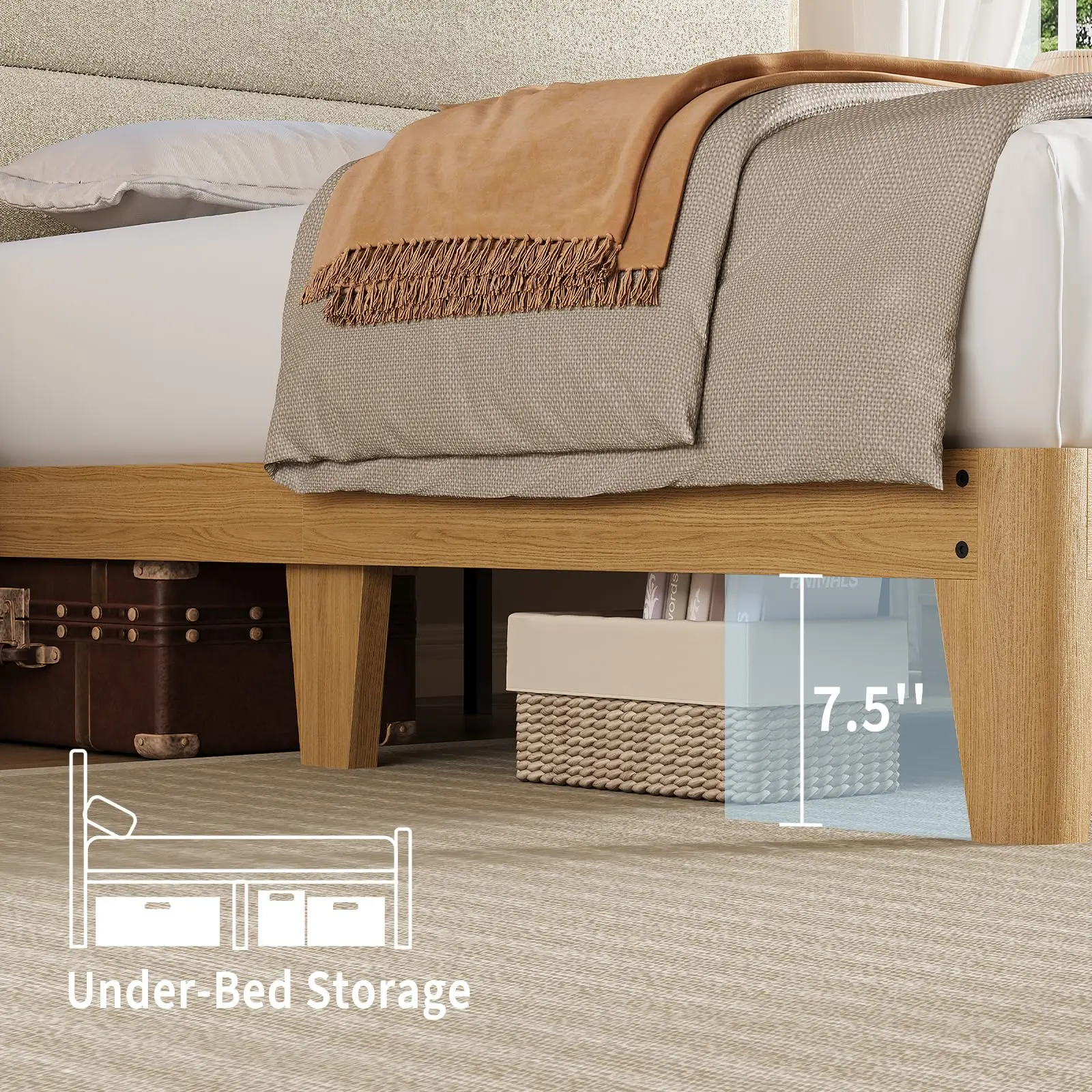 · MULTI-FUNCTIONAL STORAGE SPACE: The headboard is equipped with a 2-tier storage shelf, which can easily store small items such as cell phones, glasses and books; the spacious under-bed storage space can store luggage, shoe boxes and some storage boxes