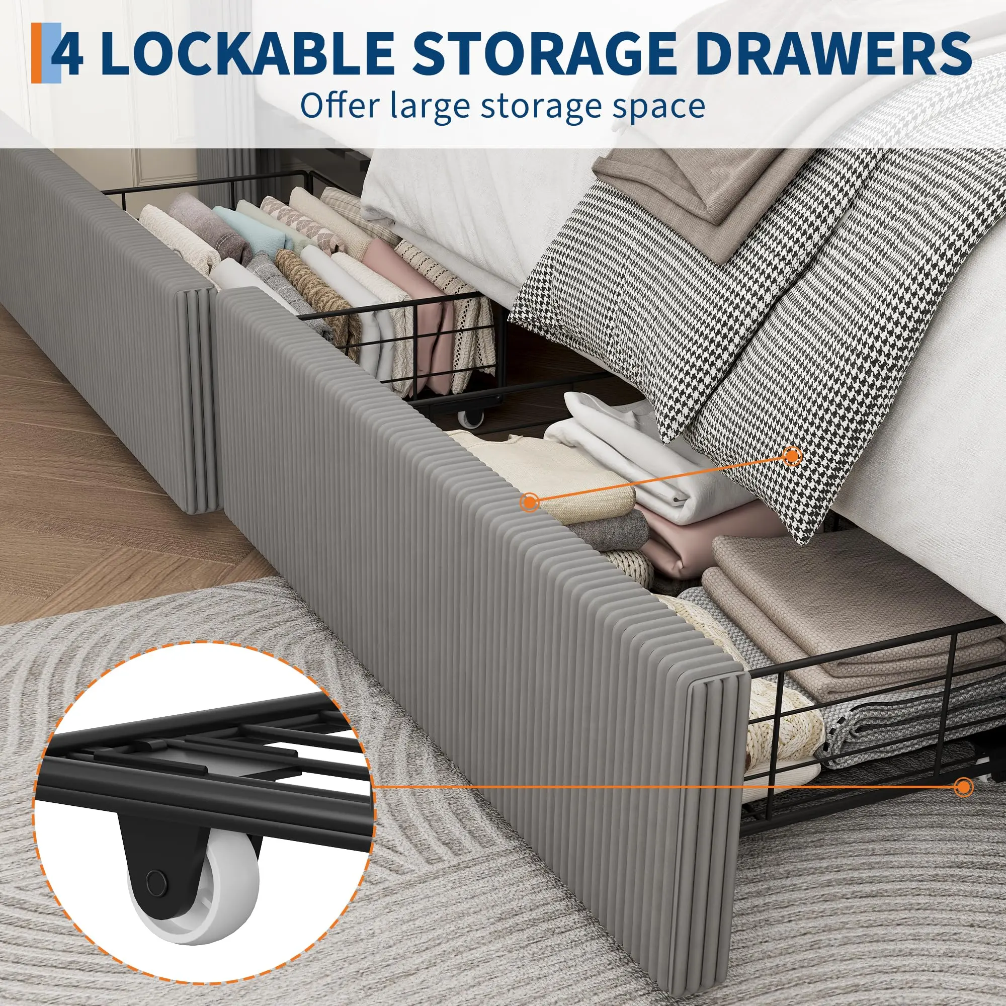 · Storage Drawers Included: Features four spacious drawers on wheels beneath the bed frame, perfect for storing seasonal bedding, linens, and personal items with easy sliding access.