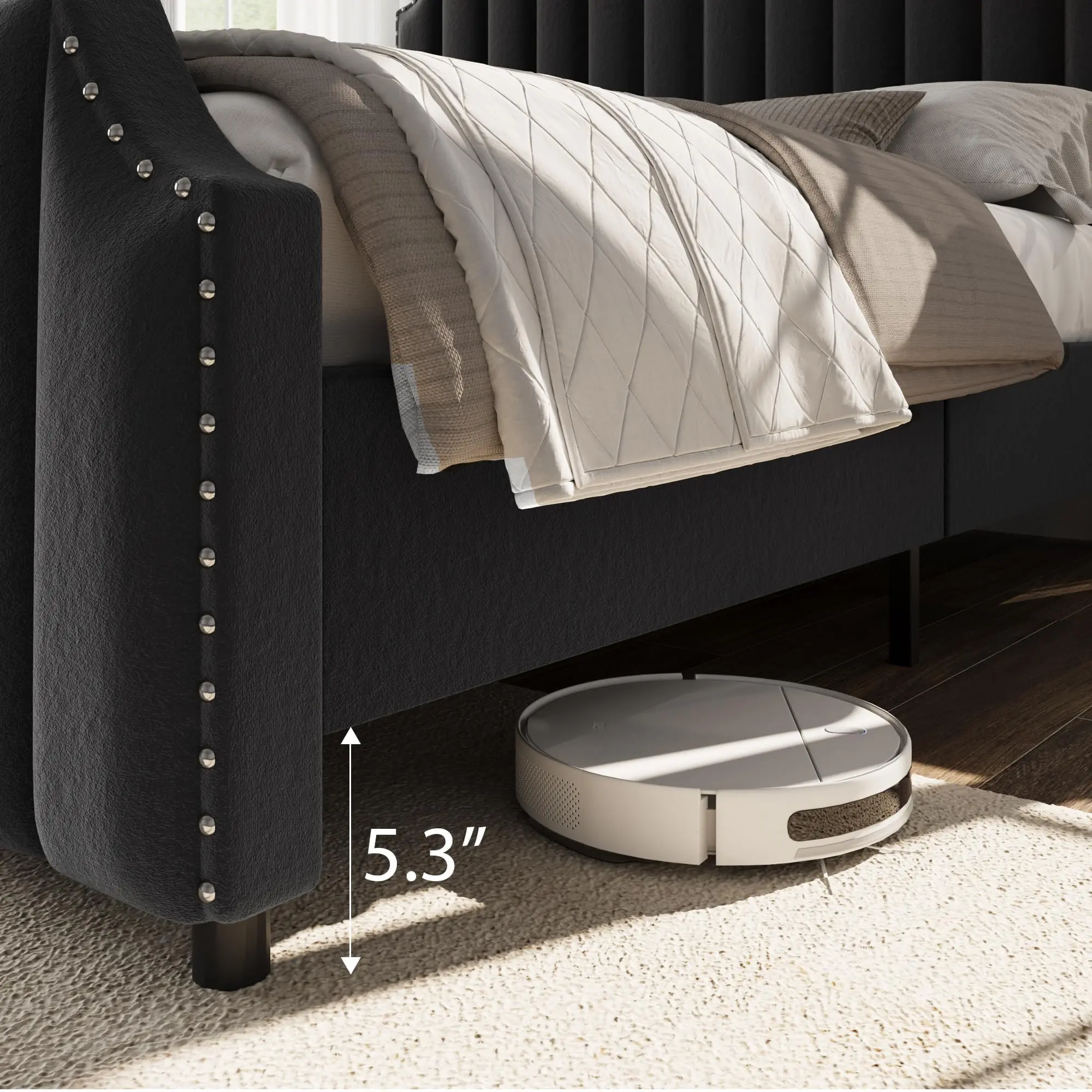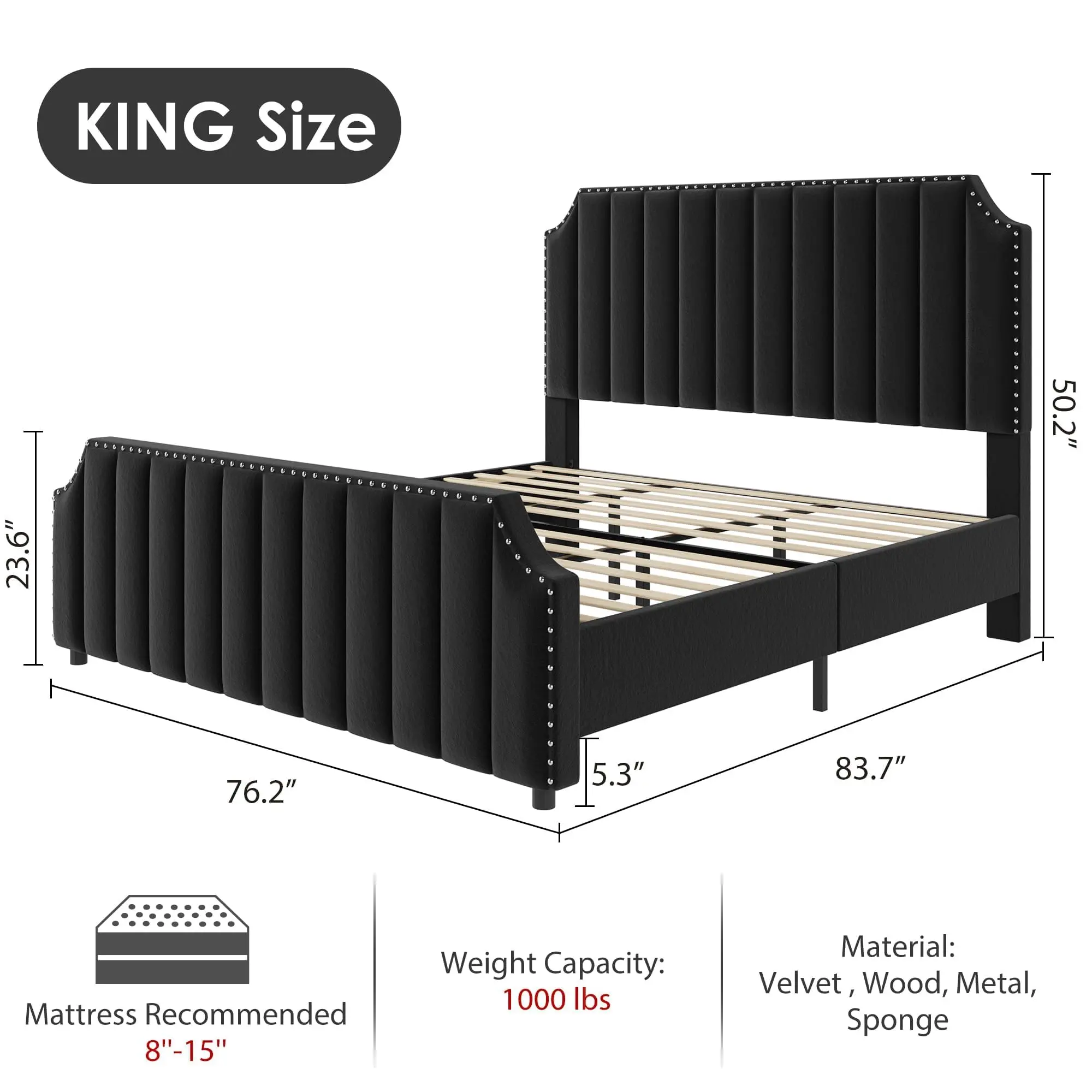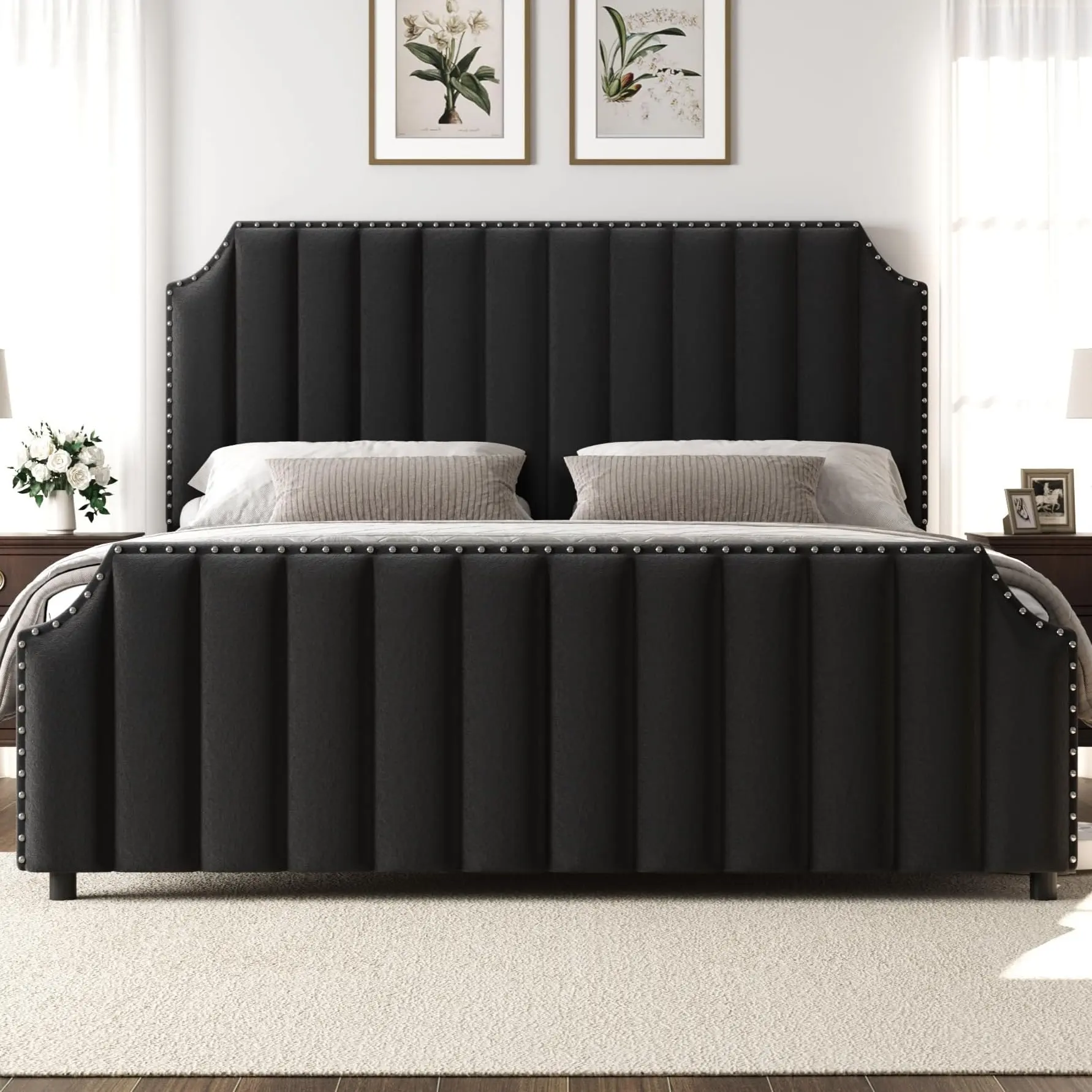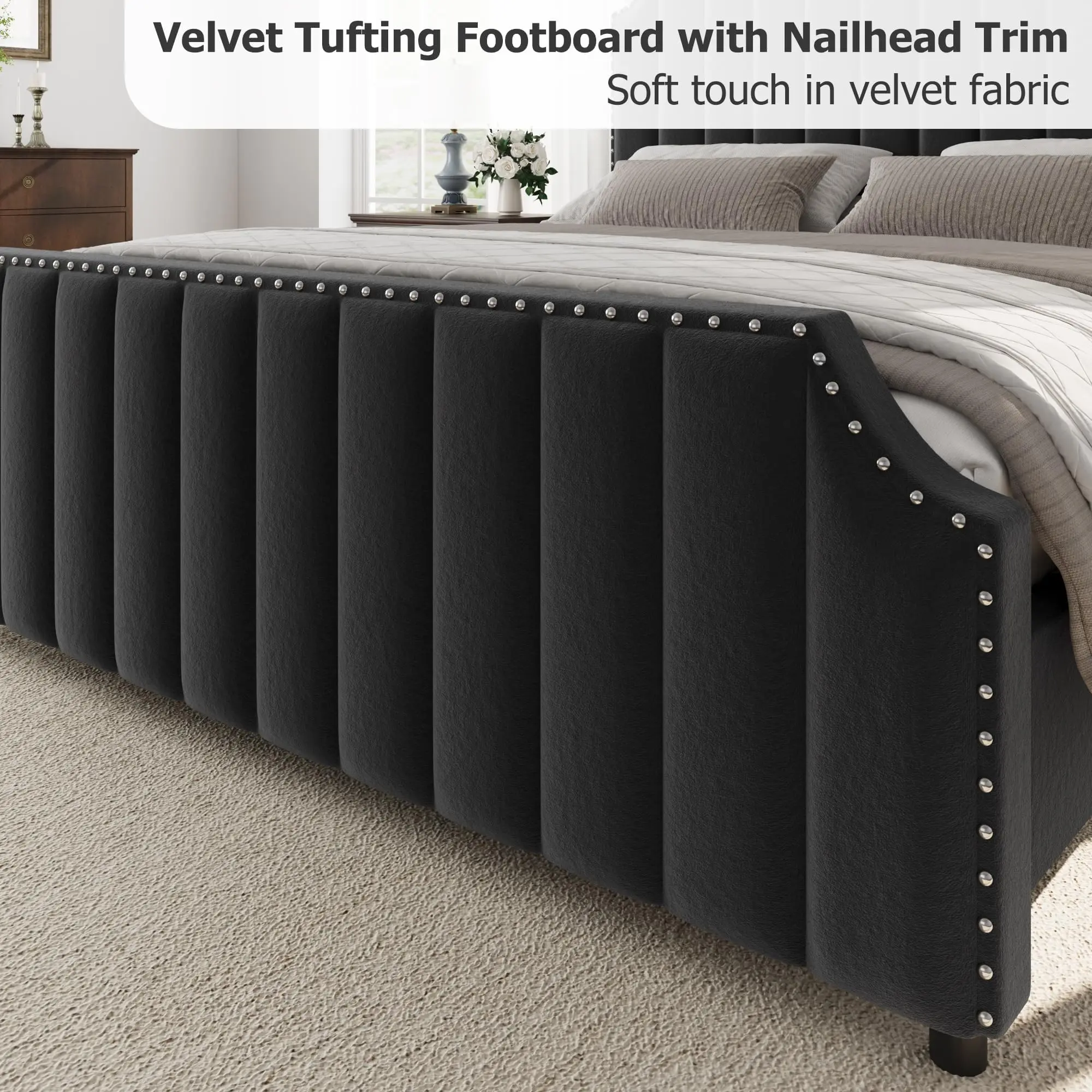 · 【Tall, Luxurious Headboard & Footboard】Features an impressive 50.2 in headboard and 23.6 in footboard with vertical channel tufting and elegant nailhead trim, adding a sophisticated and regal look to any bedroom.