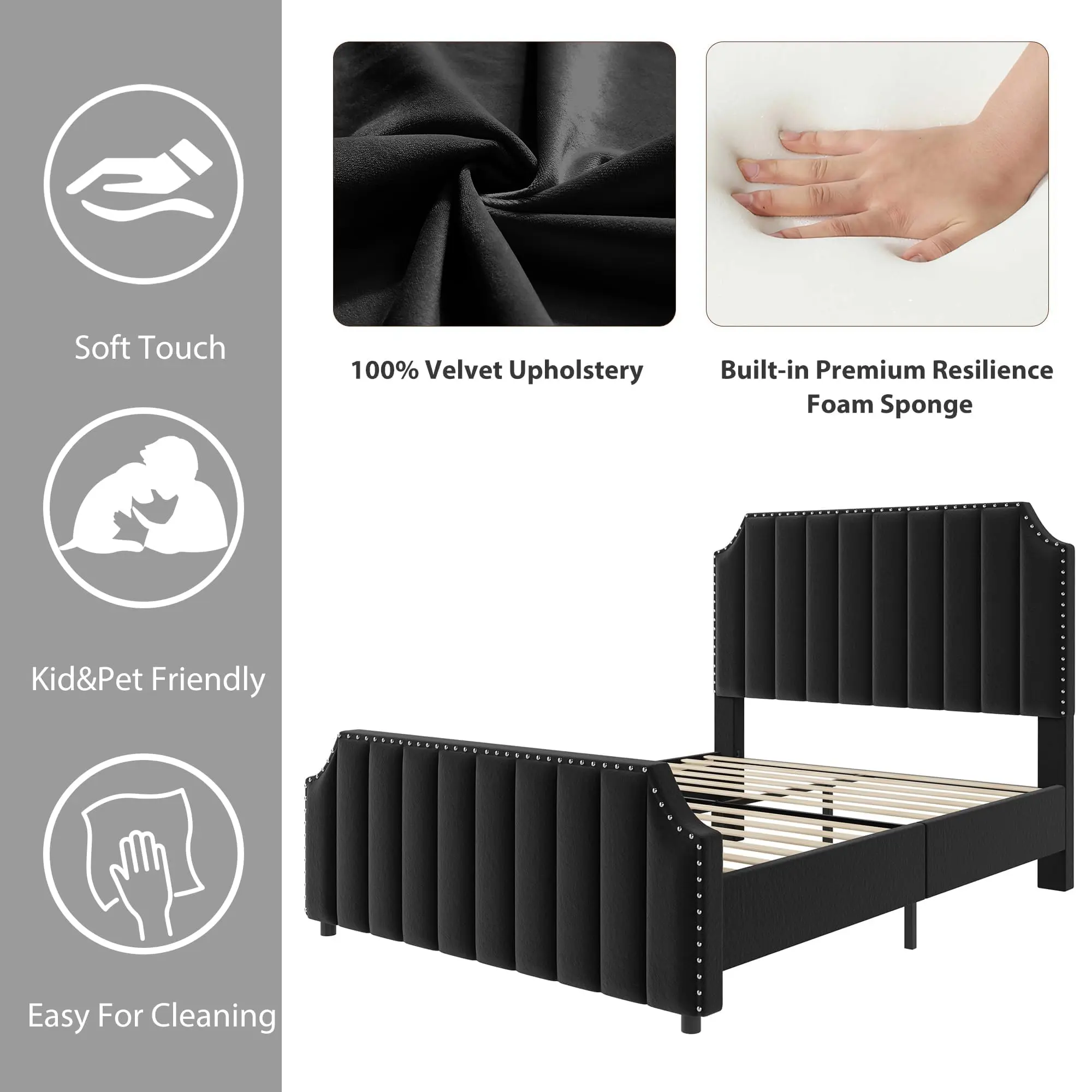 · 【Soft Velvet Comfort & Silent Nights】Wrapped in plush velvet and padded with EVA foam for noise reduction, this queen bed frame delivers cozy comfort and keeps your nights quiet—no creaks or squeaks.