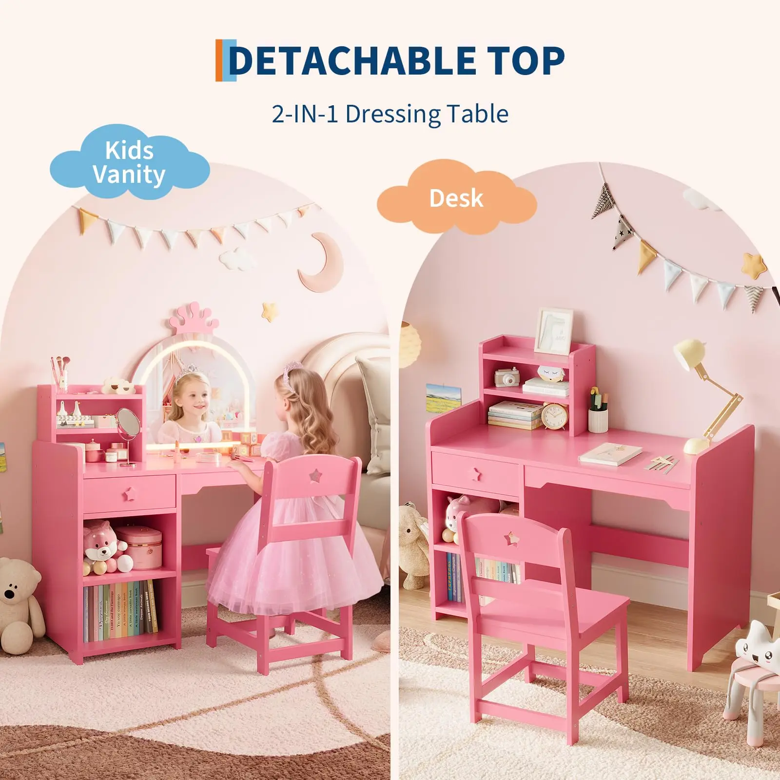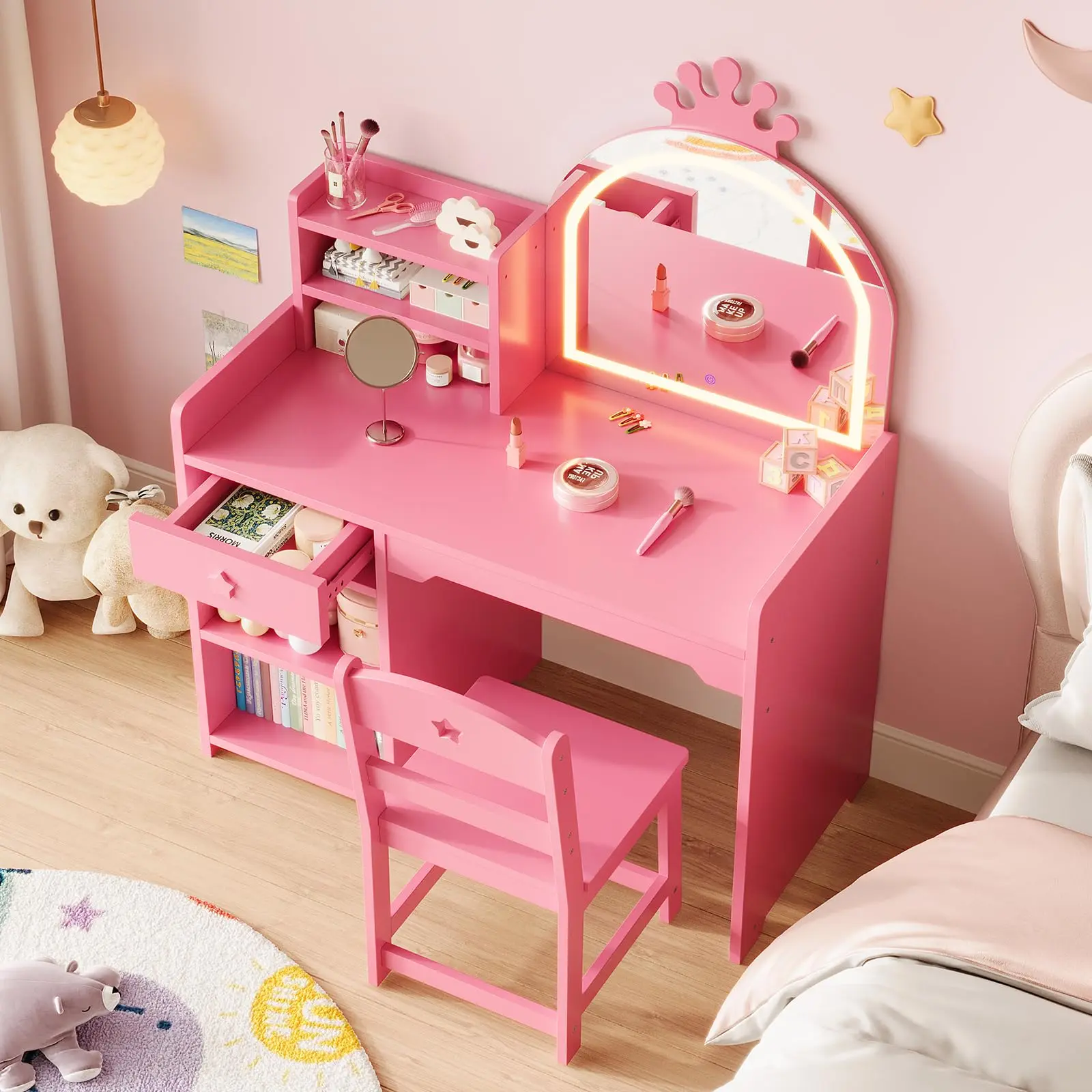 5. GARVEE 2-in-1 Lighted Mirror Vanity Set with Open Bookshelf, Storage Cabinet, and Shelves - Purple Wooden Dressing Table and Chair for Bedroom
