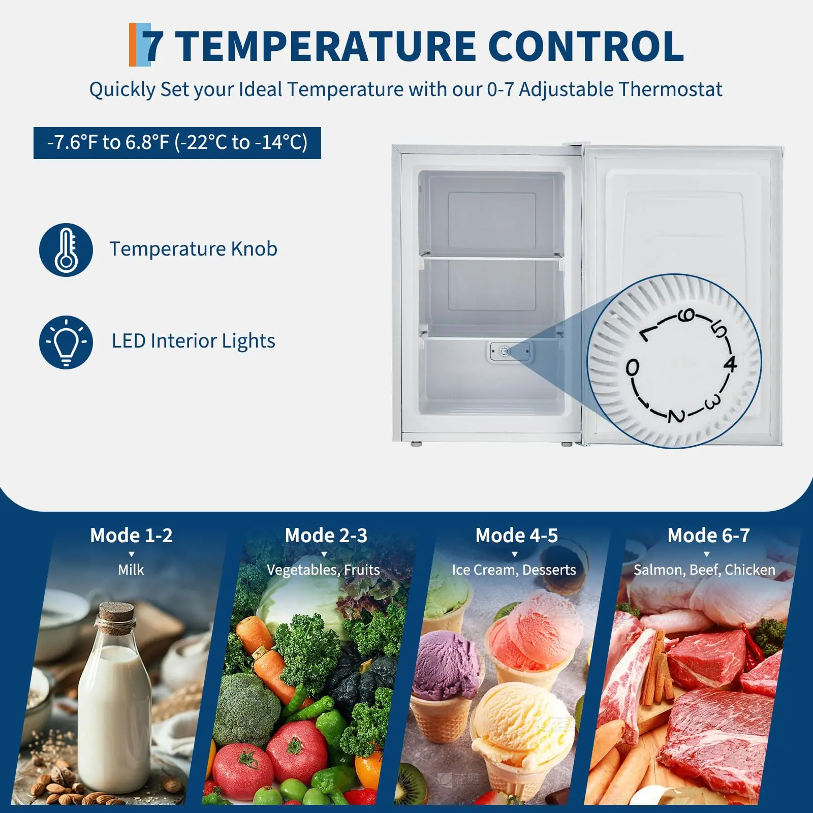 · Adjustable Temperature Control: Equipped with an upright freezer with adjustable thermostat, this mini upright freezer offers 7 customizable temperature settings from 6.8℉ to -7.6℉ (-14°C to -22°C). Tailor the freezing conditions to match your requirements, ensuring optimal preservation for all your frozen items