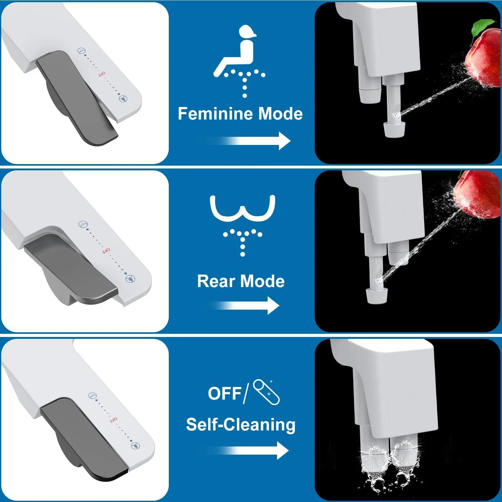 · Dual Nozzle System: Features a dual nozzle system providing effective and hygienic cleaning for both posterior and feminine wash, ensuring comfort and cleanliness.