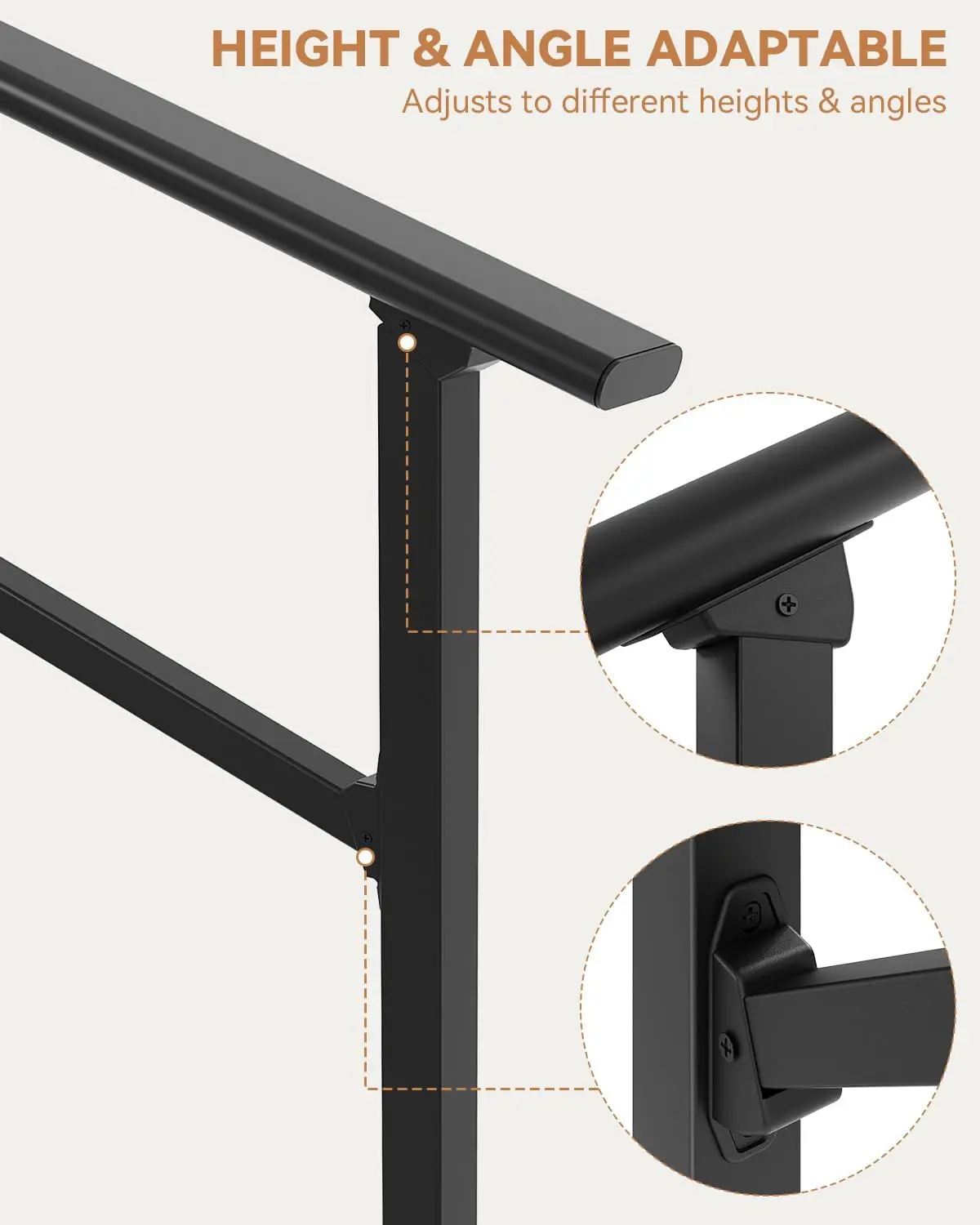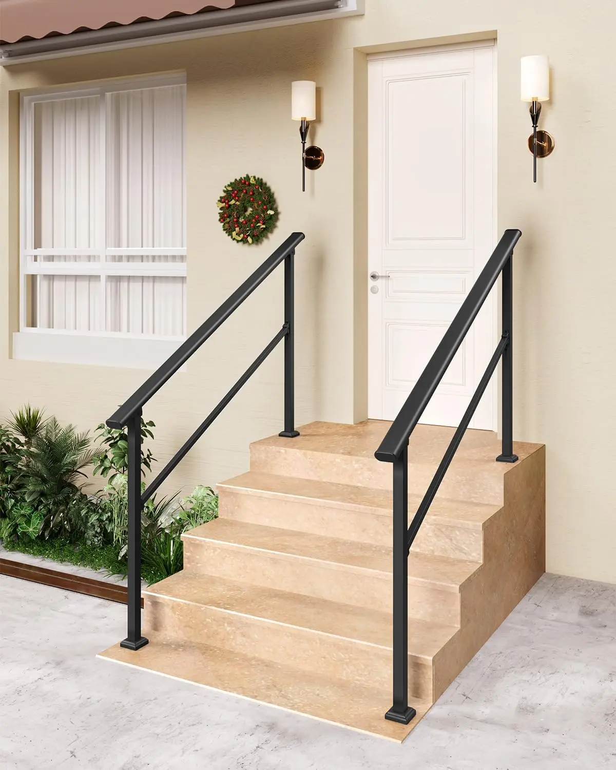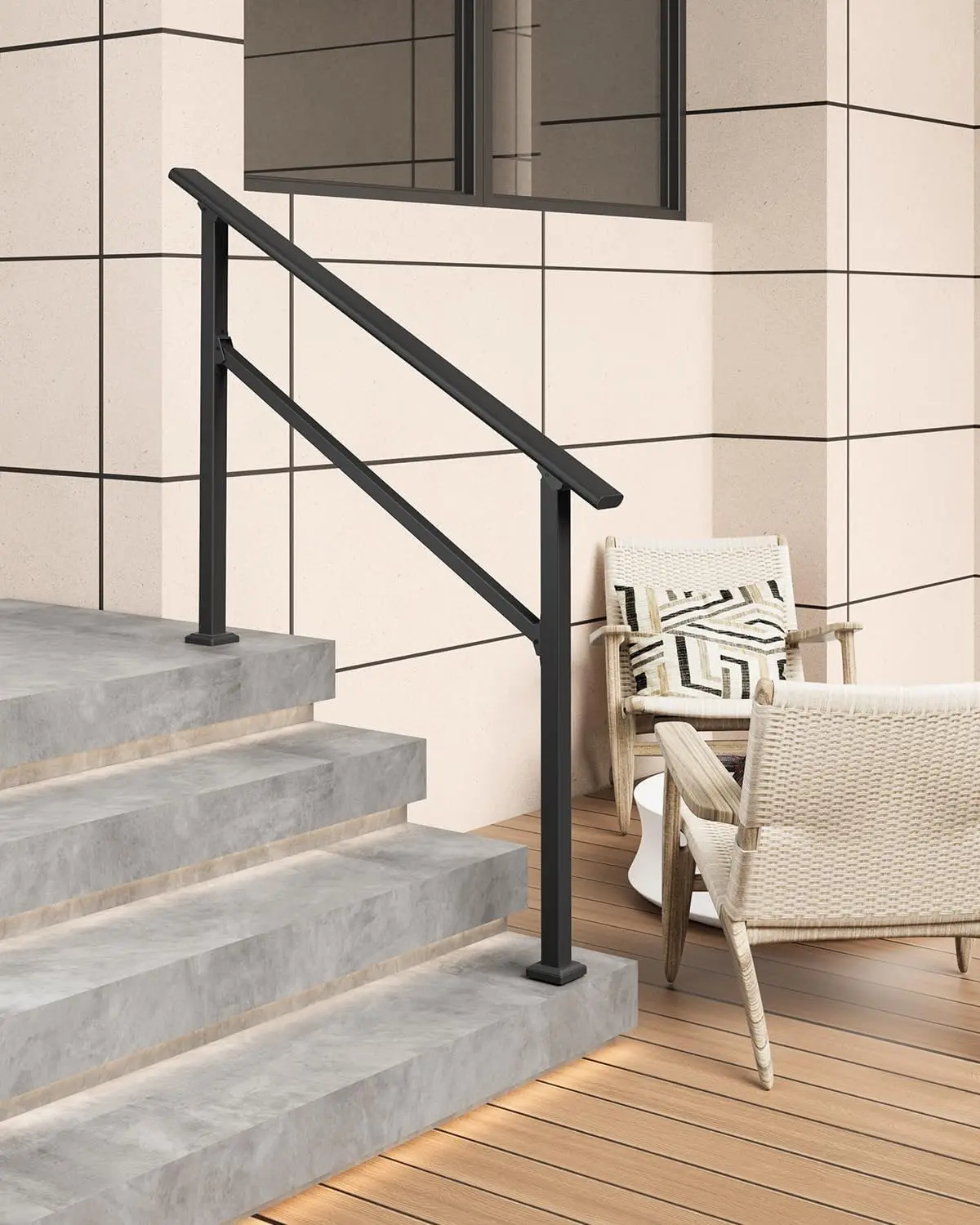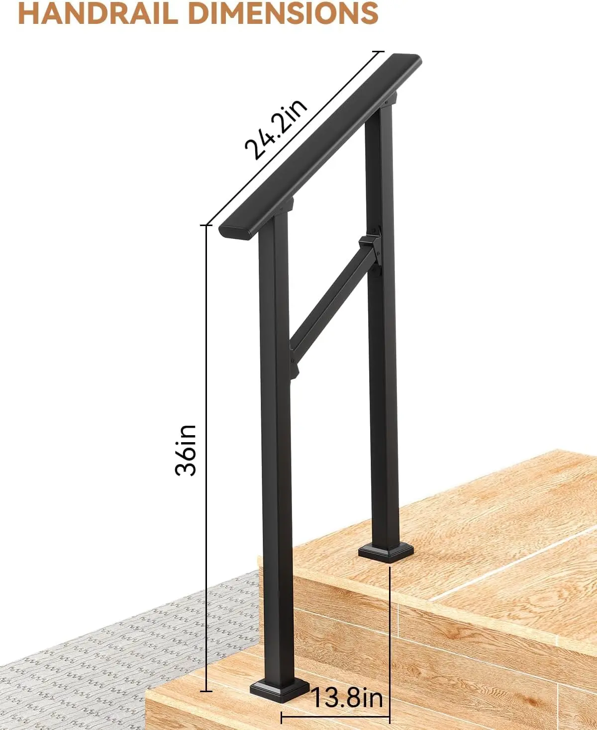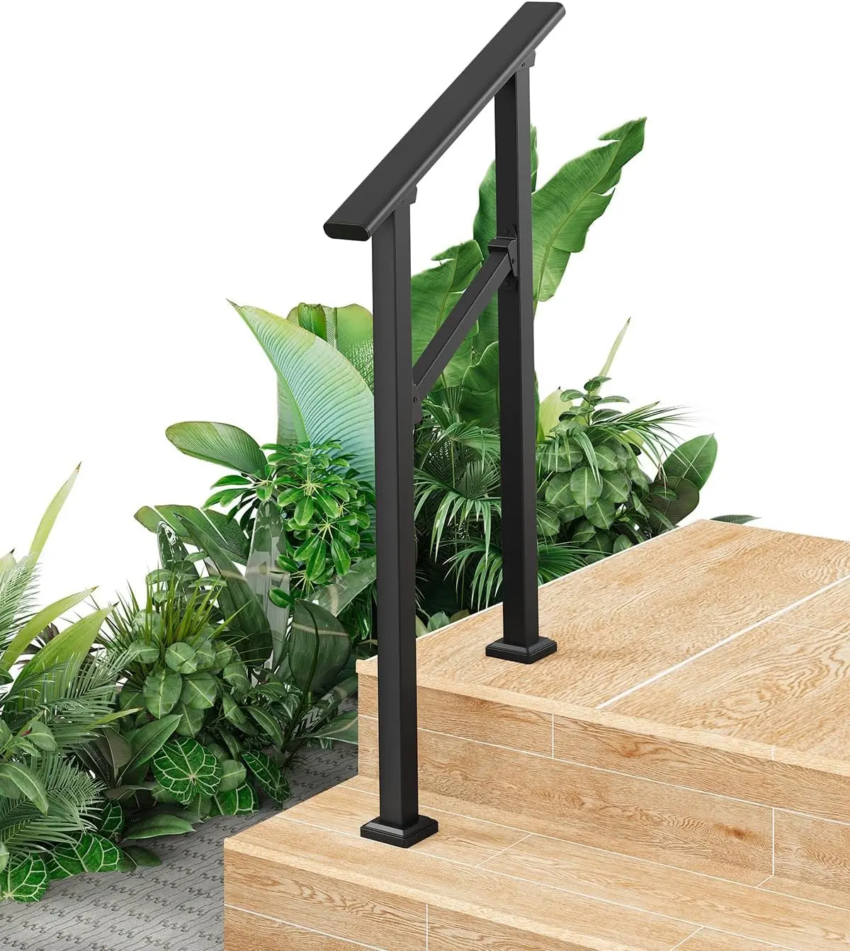 · Adjustable from 0° to 45° for Flexible Installation - The 2 step stair handrail can be adjusted from 0 to 45 degrees, allowing it to perfectly fit the slope of most standard 2 step (2-riser) staircases. This versatile design also enables installation on horizontal surfaces, such as alongside a walkway or at a flat entrance, providing support where you need it most