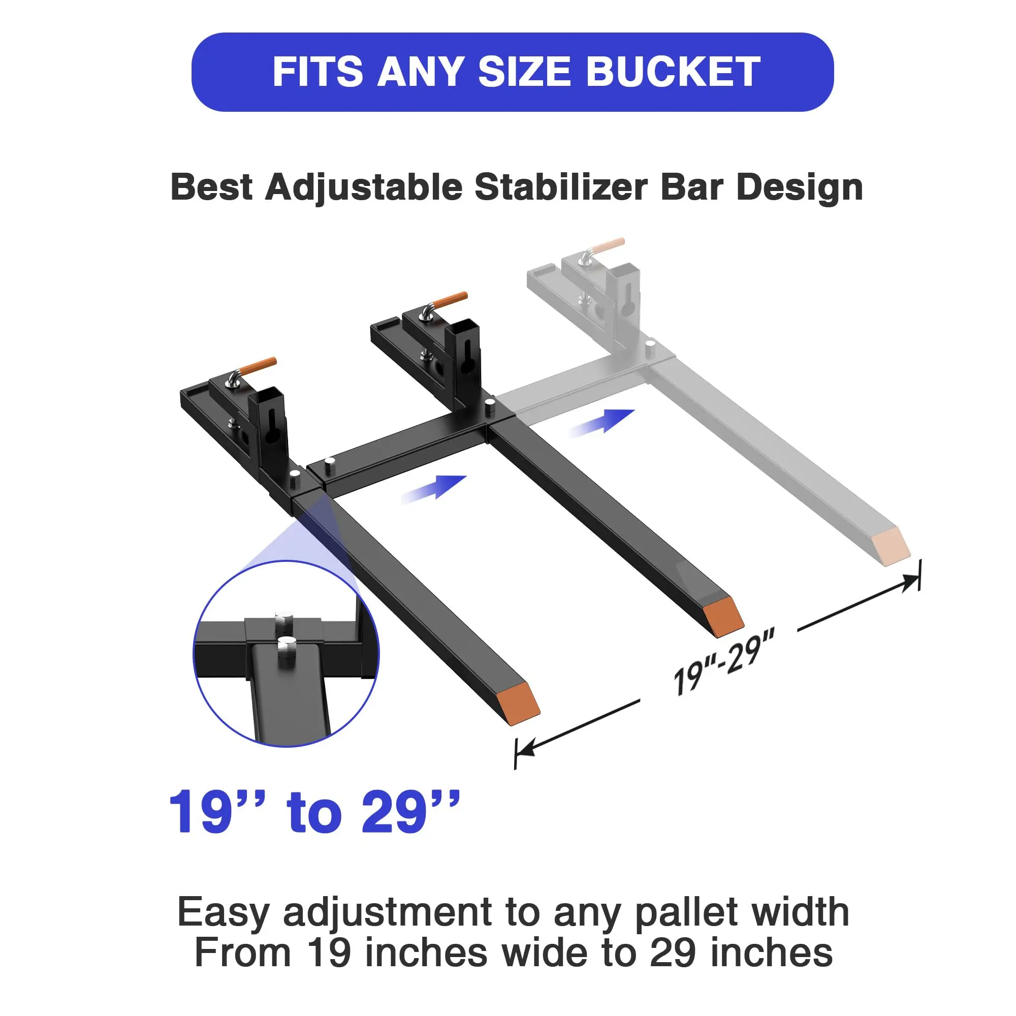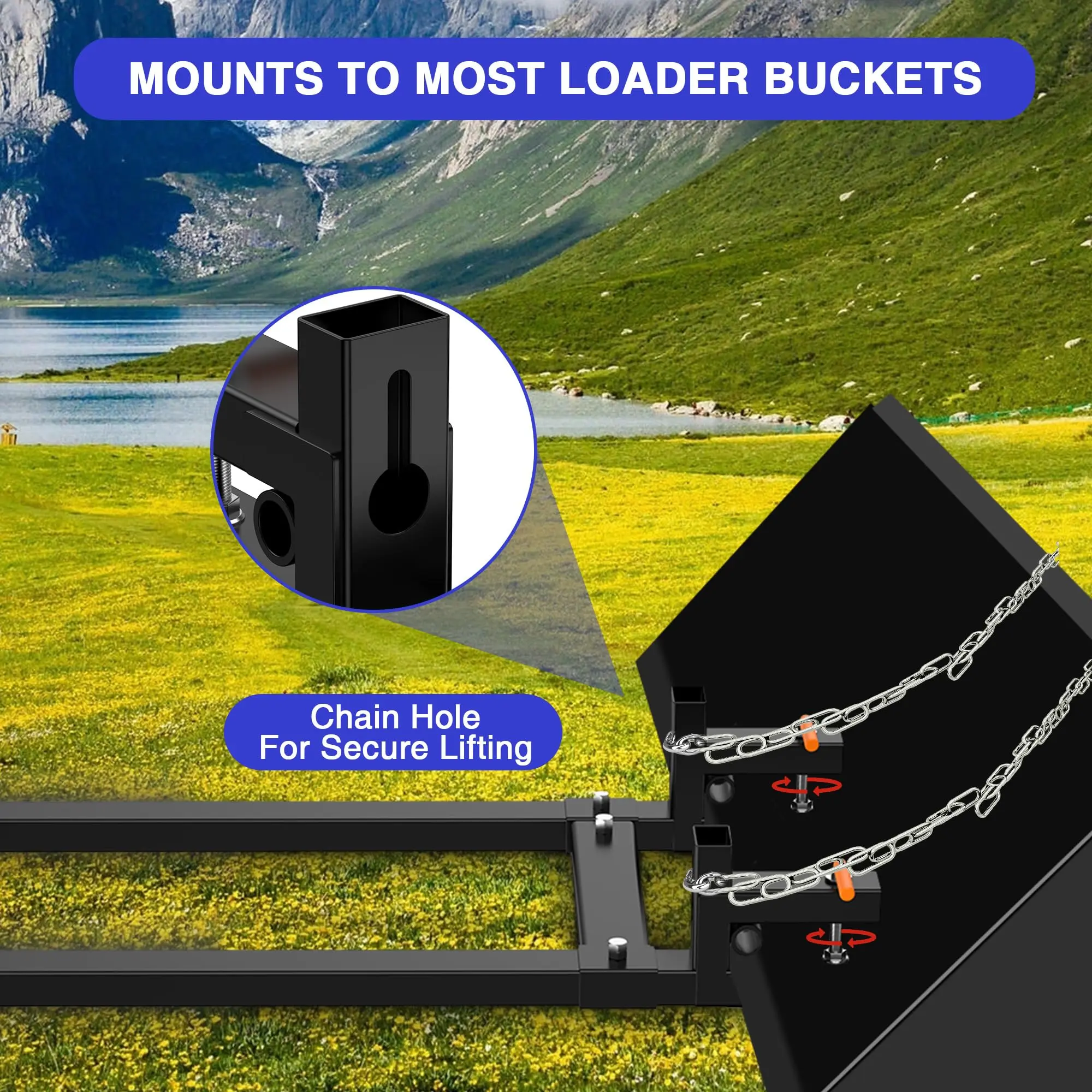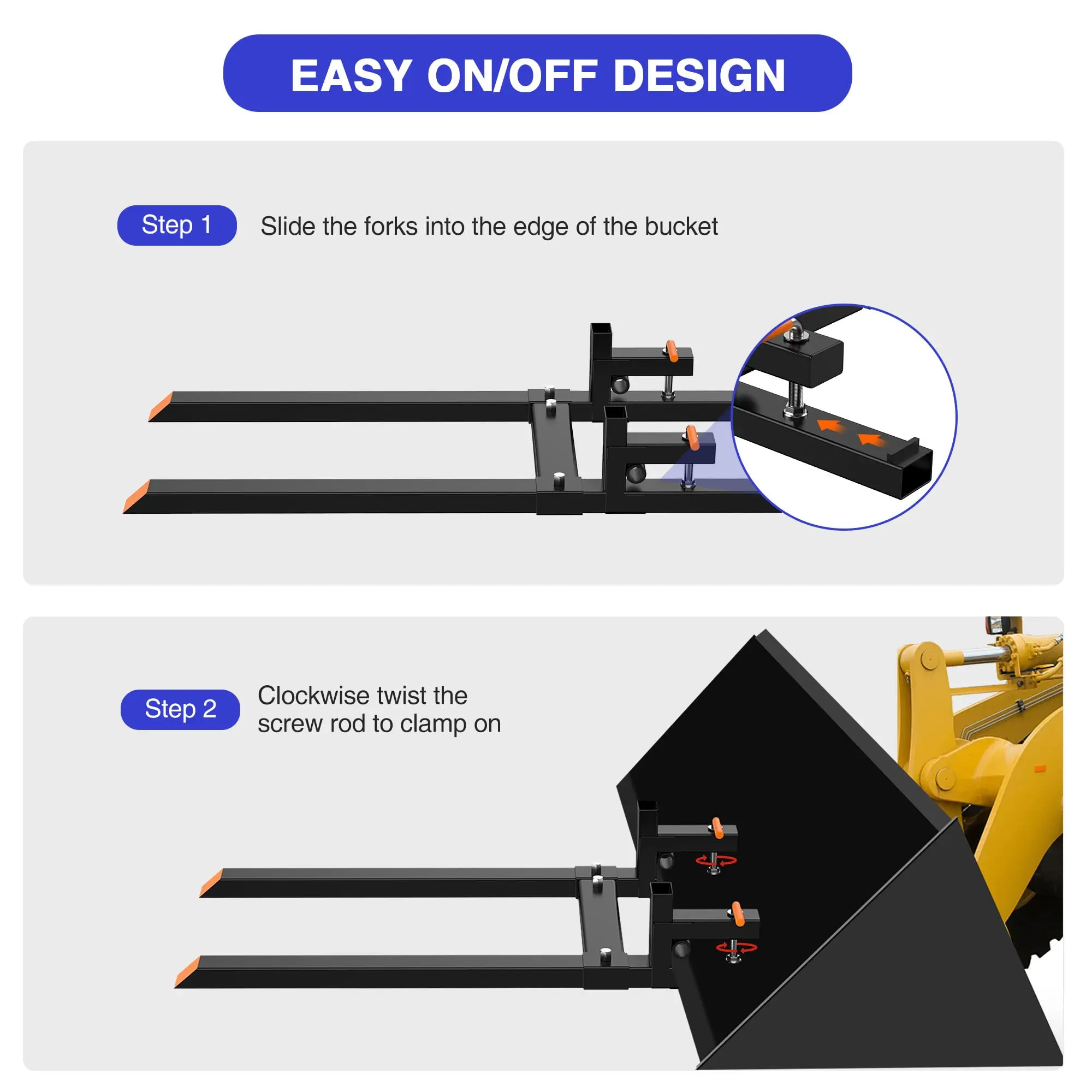 · Effortless Setup and Adaptability: Featuring a simple clamp-on mechanism, these pallet fork attachments eliminate the need for drilling or welding, easily fitting most tractor buckets, skid steers, and loaders
