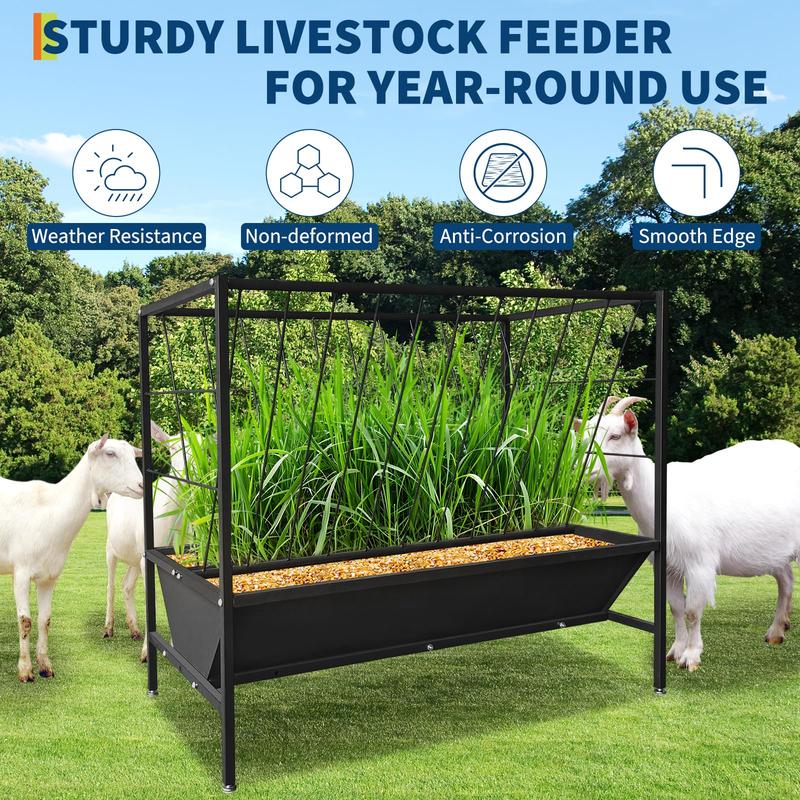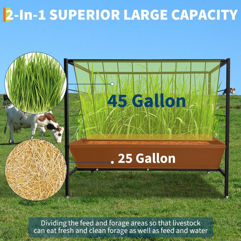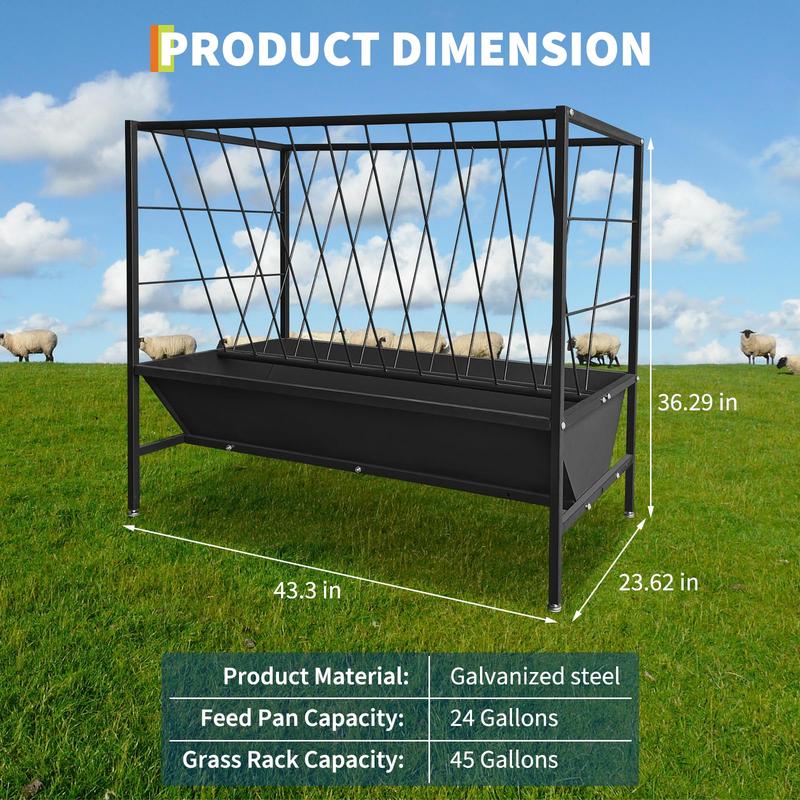 · 【2-in-1 Livestock Feeder】--This heavy-duty pasture hay feeder combines a 24-gallon bottom feed pan with a 45-gallon top grass rack, offering ample space for livestock to graze freely while minimizing your daily refills. It saving much of your time and effort.