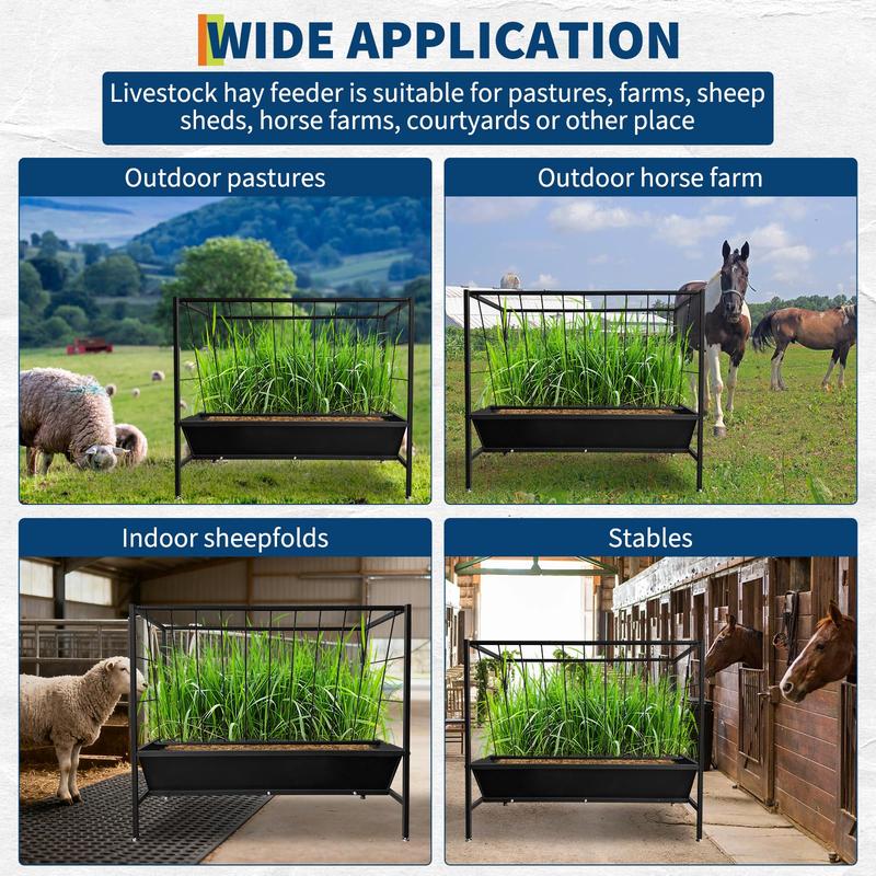 · 【Easy to Install and Maintain】--Our livestock feeder has pre-drilled mounting holes and comes with instructions and installation tools for quick installation. Maintaining a clean feeding environment is a breeze with our hay grain livestock feeder, if there is dust and dirt on their surface, just needs a simple wipe to clean it up.