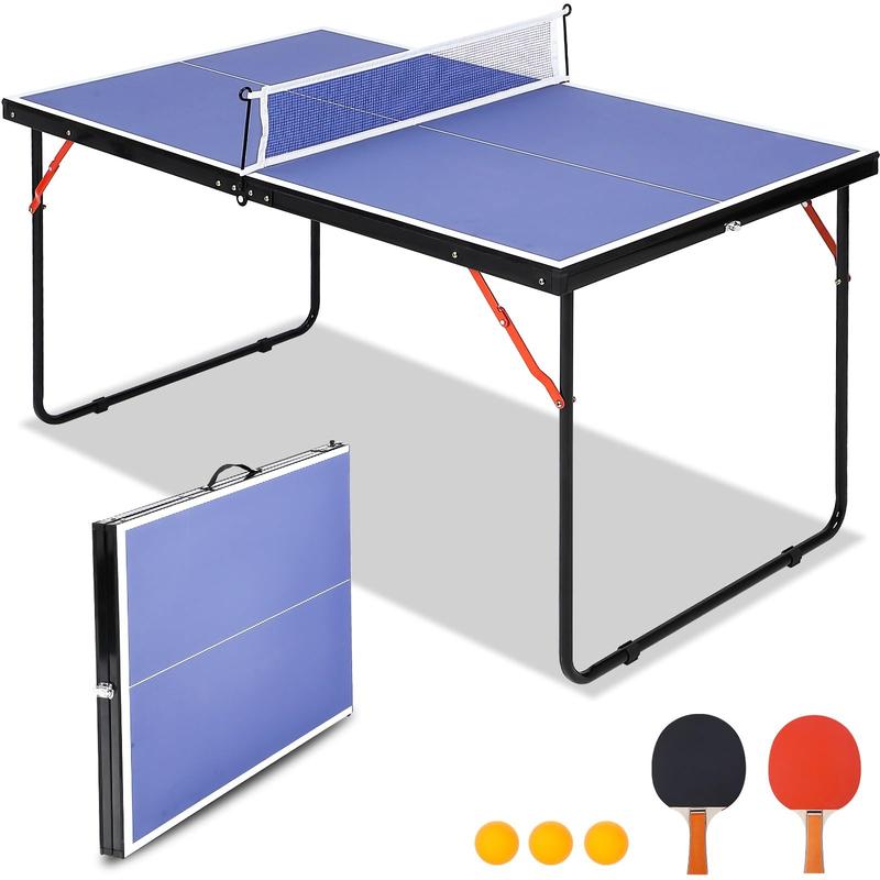 · 【Portable & Foldable Design】Our ping pong table features a portable and foldable design, allowing for quick and easy setup without the need for tools. Simply unfold the table and you're ready to play. This compact design is perfect for game rooms, apartments, offices. Additionally, the safety locking system ensures convenient transportation and storage.The set includes a 54 x 30 x 27 inch ping pong table, 2 paddles, 3 balls, and a removable net.