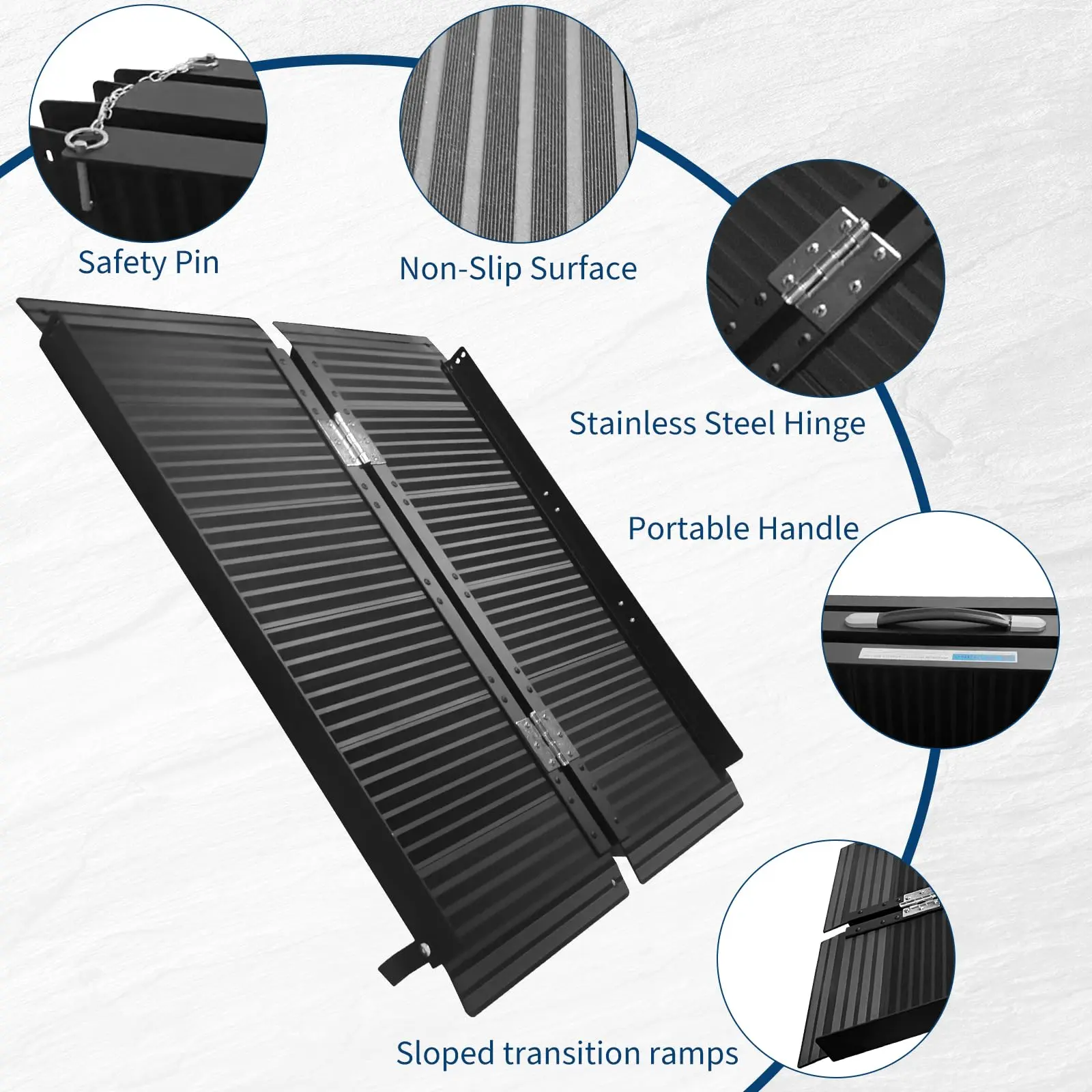 · 【Sturdy Construction】--This portable wheelchair ramp is made from high-strength aluminum material, can bear up to 800 LBS. The surface adopts black spraying technology, which is corrosion-resistant and rust-proof to ensure wheelchair ramp's long-lasting durability.