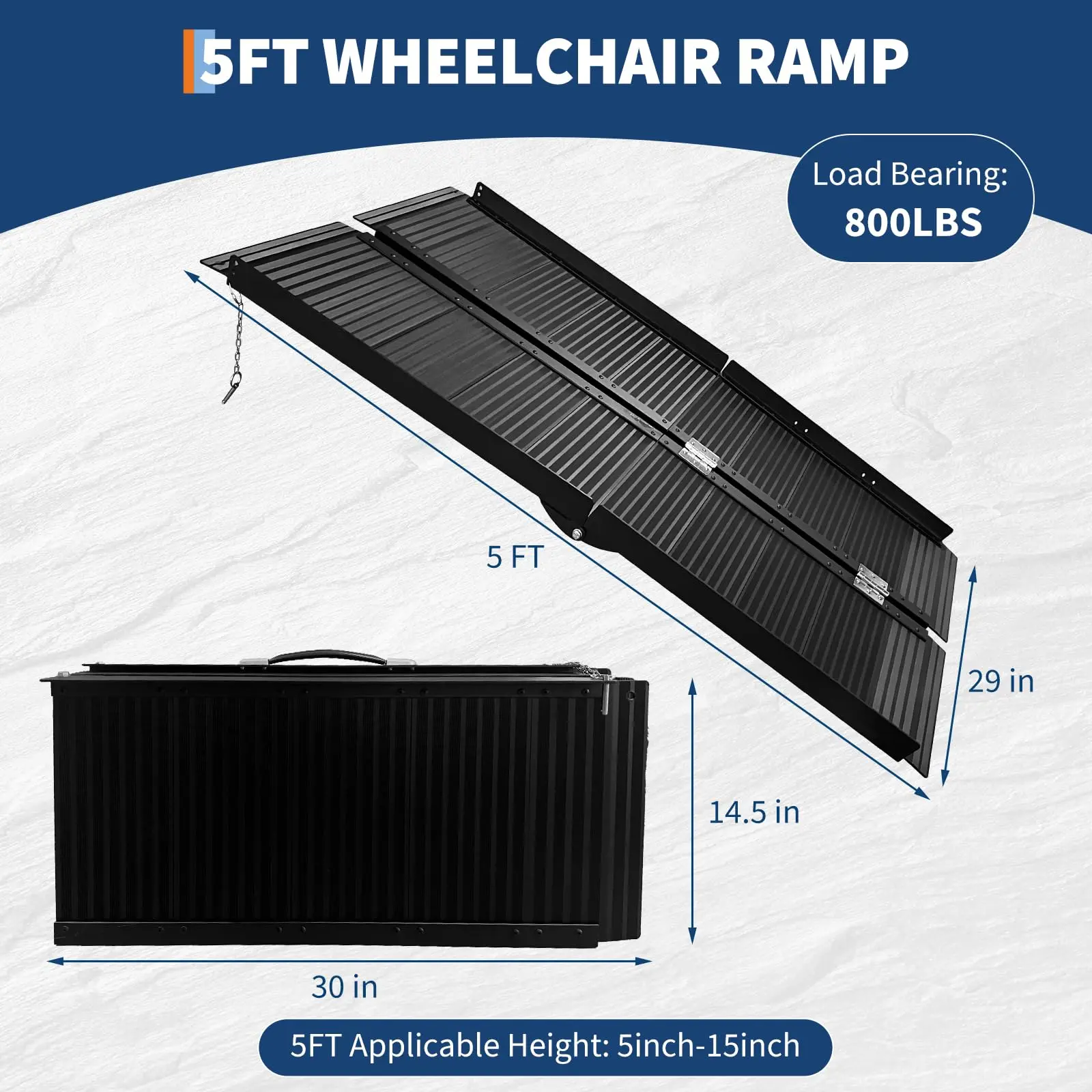 · 【Portable Wheelchair Ramp】--This folding handicap ramp is lightweight and and comes with the ergonomic handle, easy to fold for storage and transportation. An ideal choice for home or travel. Unfolded size: 60"L x 29"W. Folded size: 30"L x 14.5"W. Using height range is 5"- 15". Note: choose the right size according to your needs.
