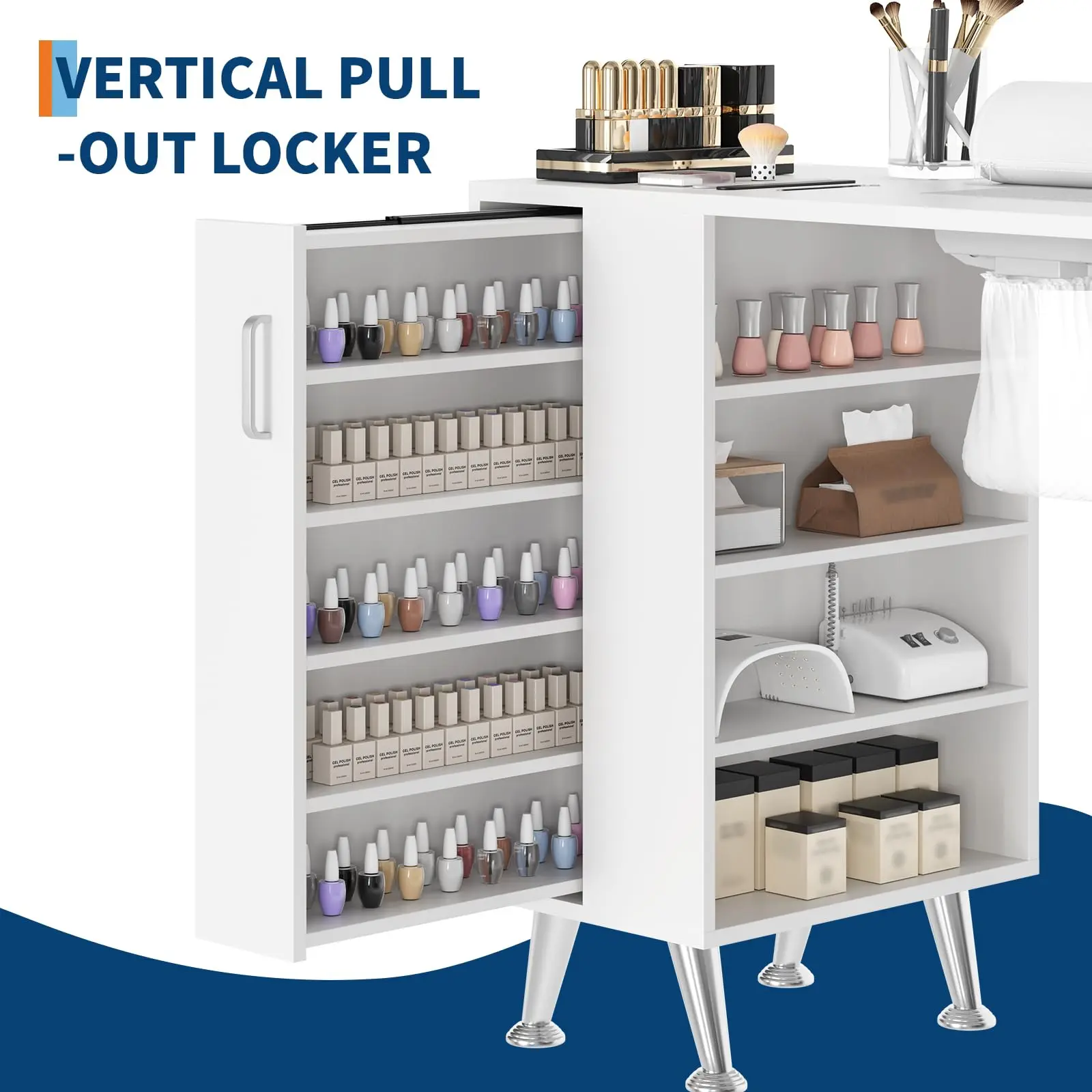 · 【Ample Storage Space】: This Professional Manicure Table includes four open shelves, a vertical pull-out locker, two drawers, and a large-capacity side cabinet for ample storage, keeping your nail supplies and tools organized and easily accessible.