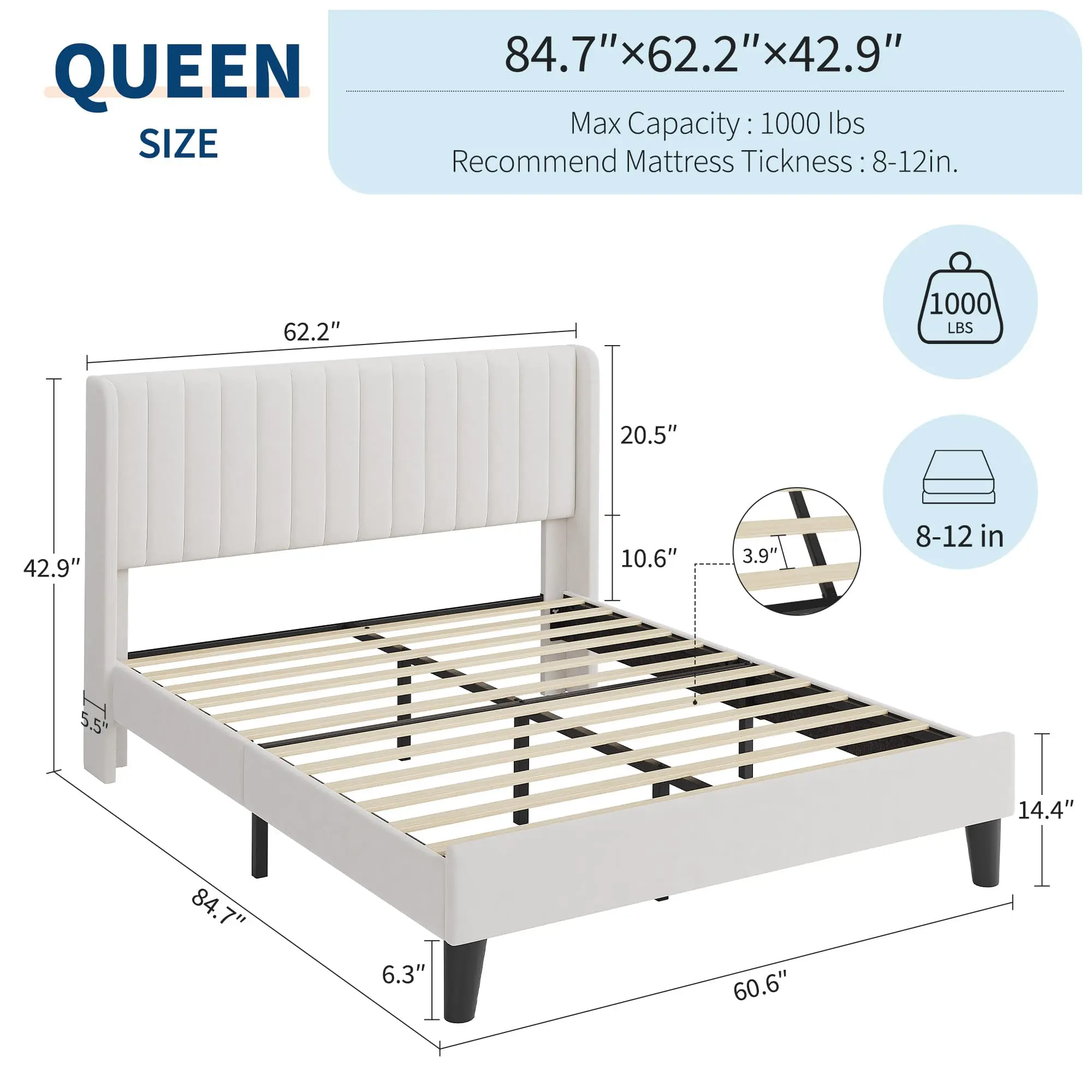 · No Box Spring Needed: Durable wooden slats are designed to support andextend the life of your mattress. Mattress thickness recommended being 8 in-12 in