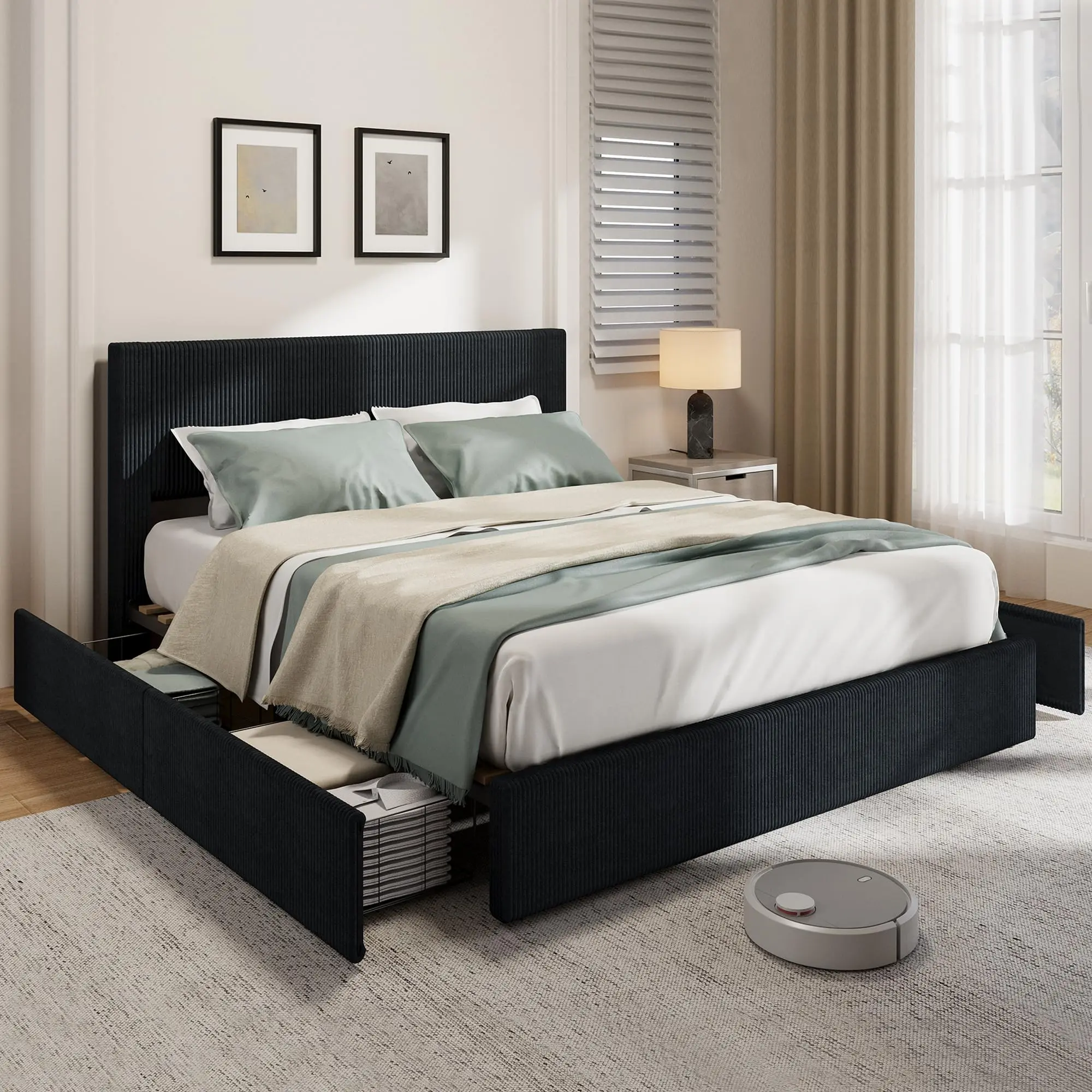 · Ample Storage Space: Declutter your space with four large storage drawers that slide out effortlessly. Perfect for extra linens, clothing, or personal items, the drawers maximize bedroom space while keeping your essentials organized and easily accessible.