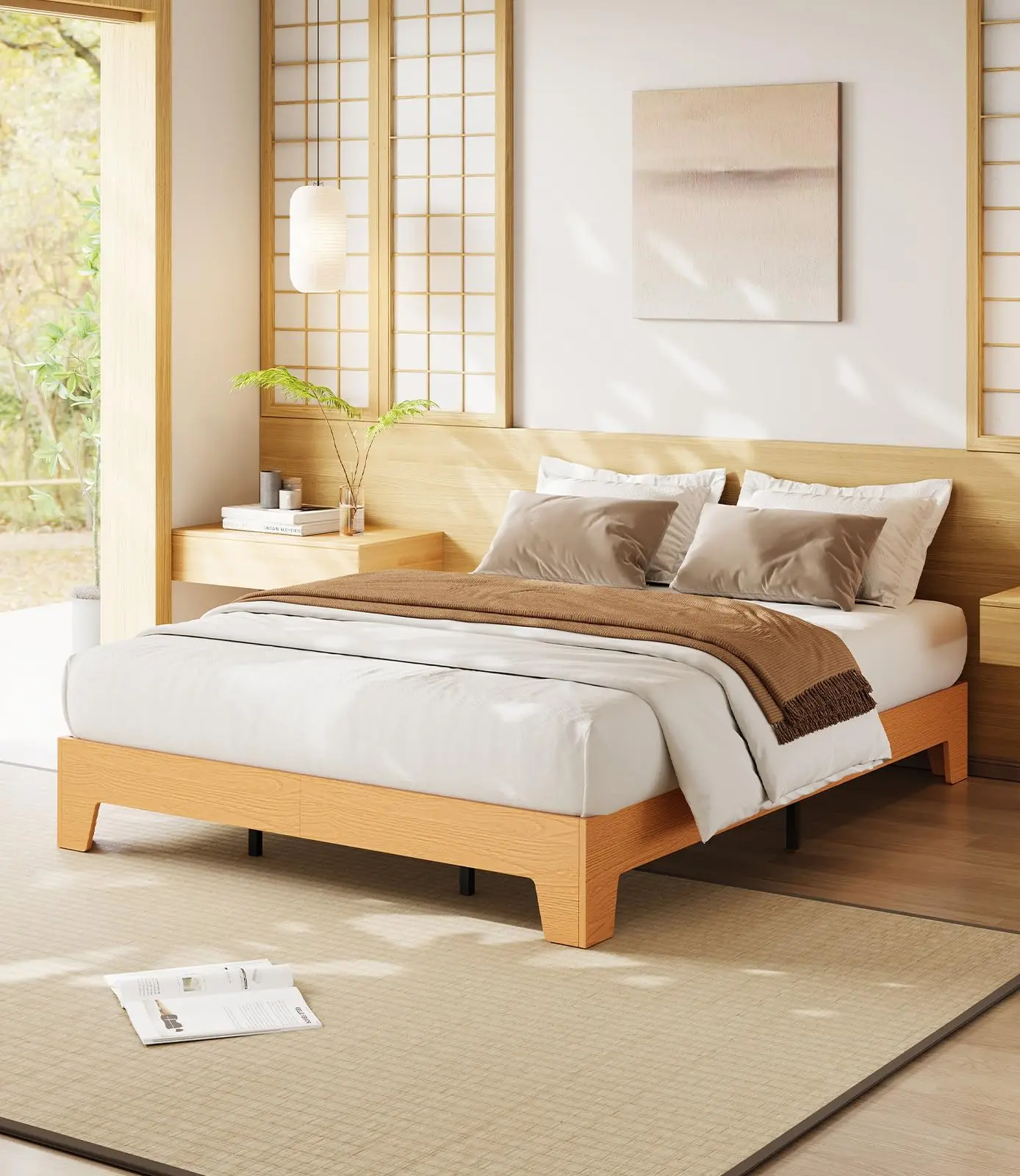 · 🛏️ Sturdy Platform Base with Reinforced Slats–No Box Spring Needed–Built with a stable engineered wood frame and strong slat support system that works with all standard mattress types (foam, hybrid, innerspring).