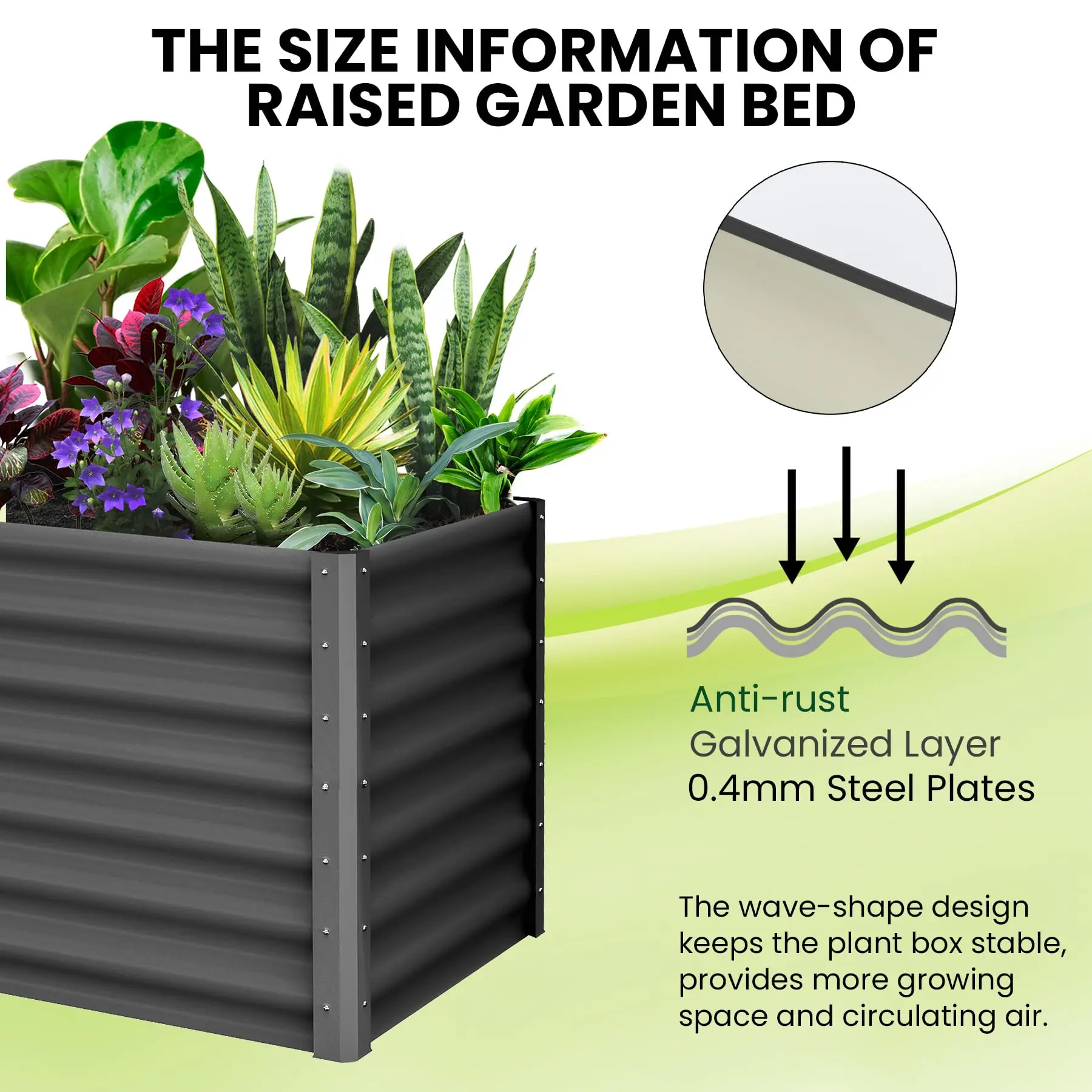 · ENHANCED STABILITY: This raised planter bed is 0.4mm thick for greater stability. The steel support rods help the metal panels maintain their shape, preventing deformation and soil leakage over time.