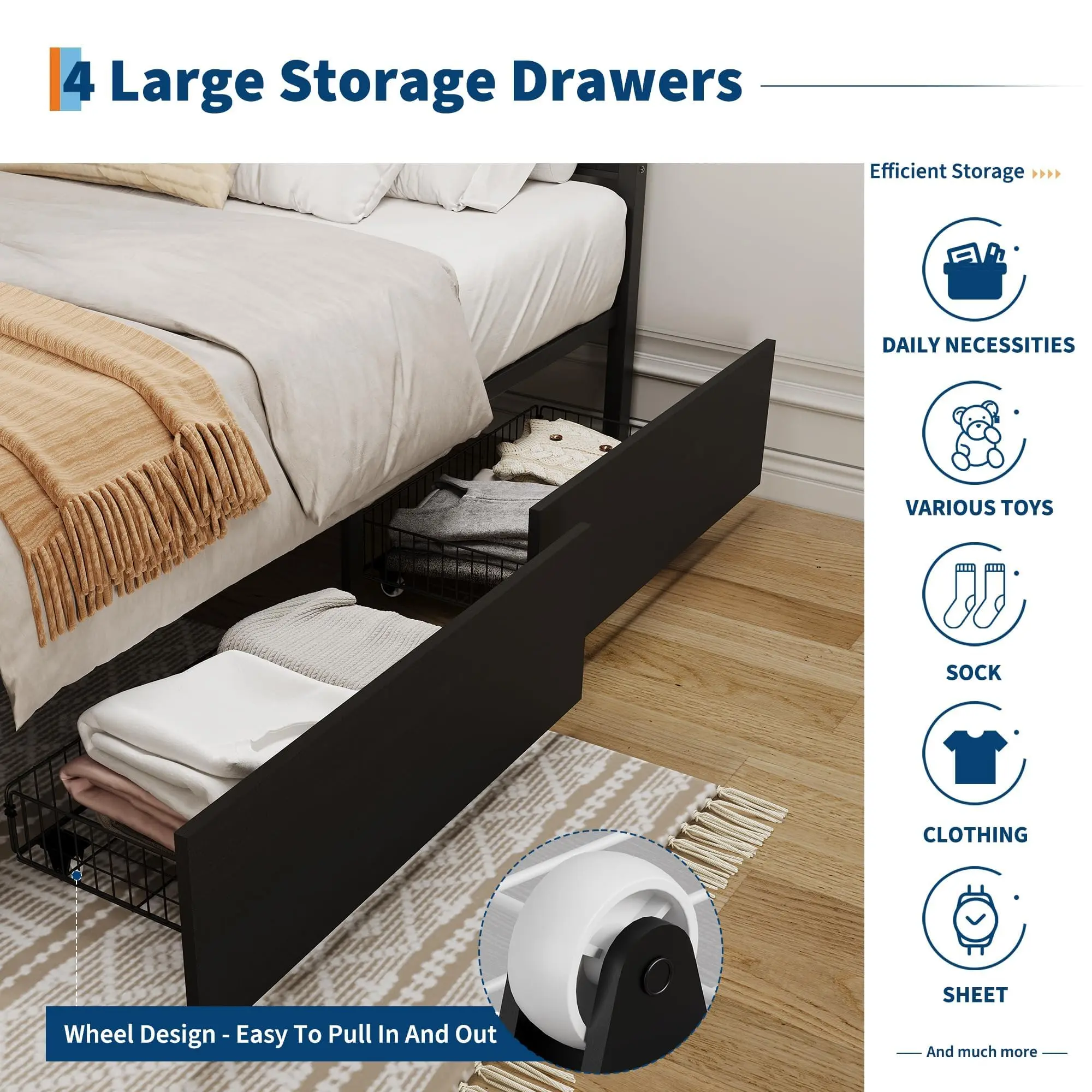 · Say goodbye to clutter with this bed frame that comes with 4 spacious drawers. The four-drawer design offers ample storage space for your bedding, personal items, or seasonal clothing. It's a great way to keep your bedroom organized and tidy while adding a touch of practicality to your furniture. The drawers blend seamlessly with the overall design, ensuring aesthetics and functionality go hand in hand.