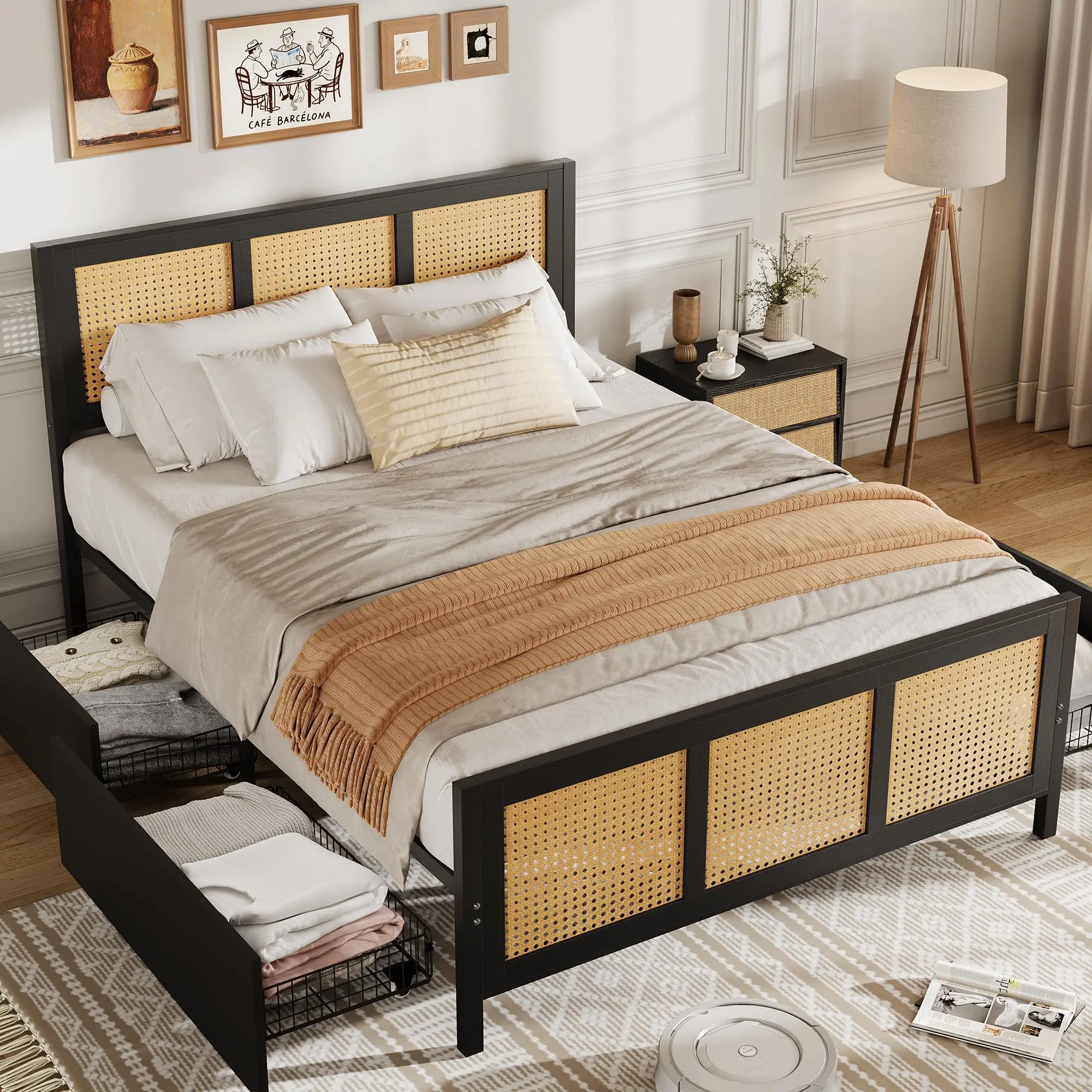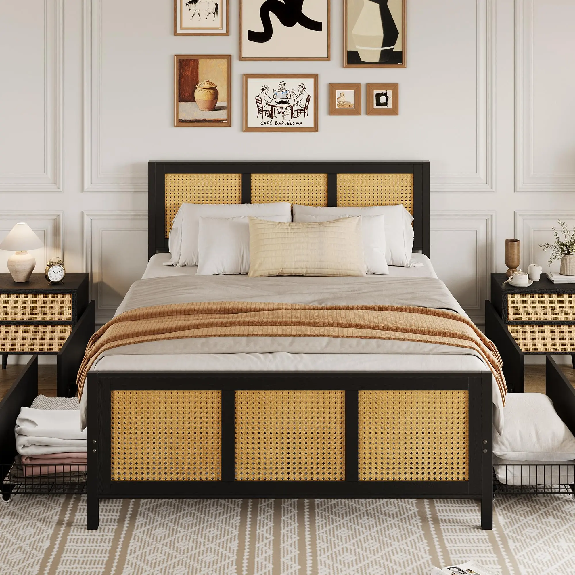 · This rattan bed frame is a perfect blend of natural charm and modern style. It features an exquisite rattan design on the headboard, paired with sturdy wooden slats and a robust metal frame. This combination not only adds a unique touch to your bedroom but also ensures long-lasting durability. Its stylish appearance seamlessly complements any decor style, from bohemian to contemporary.