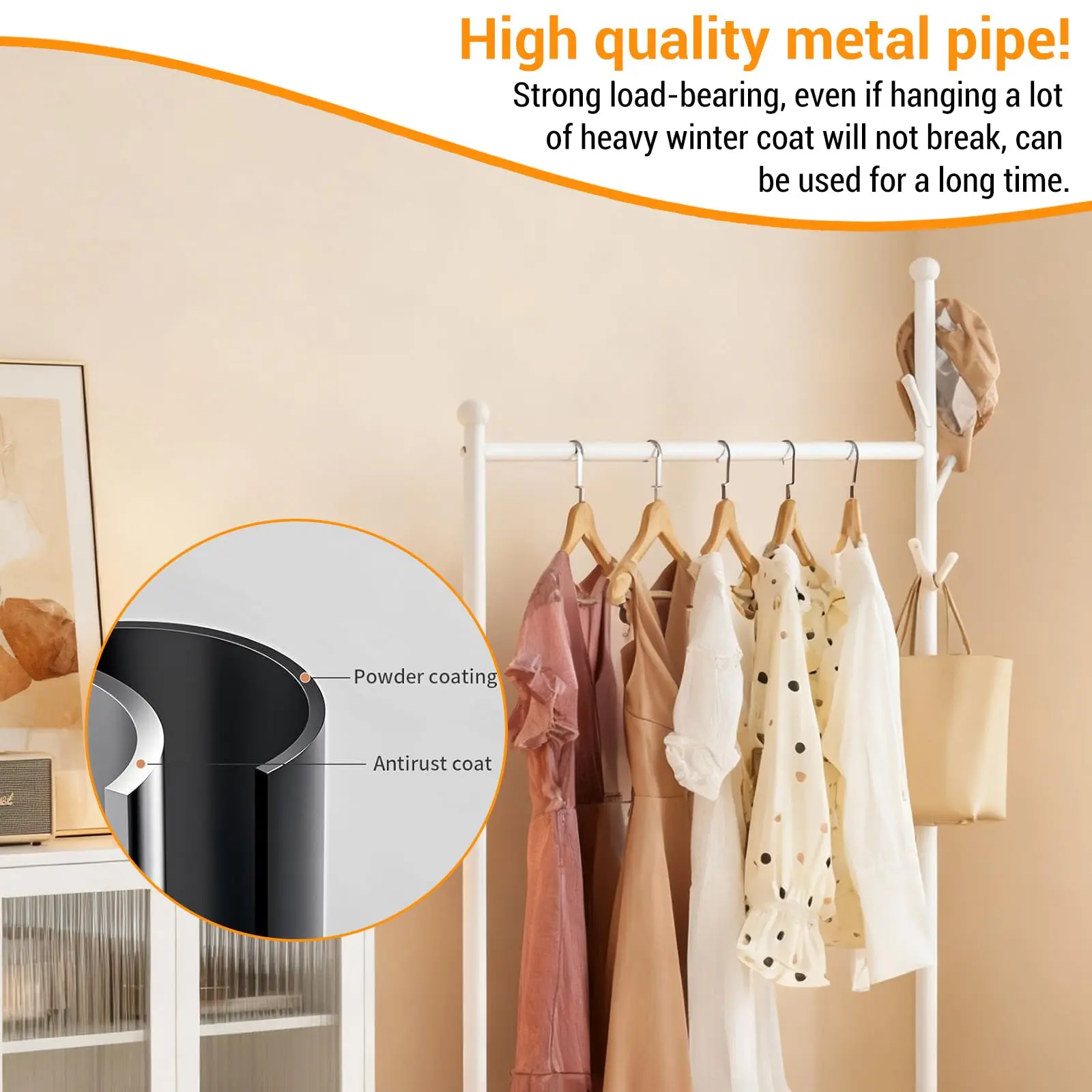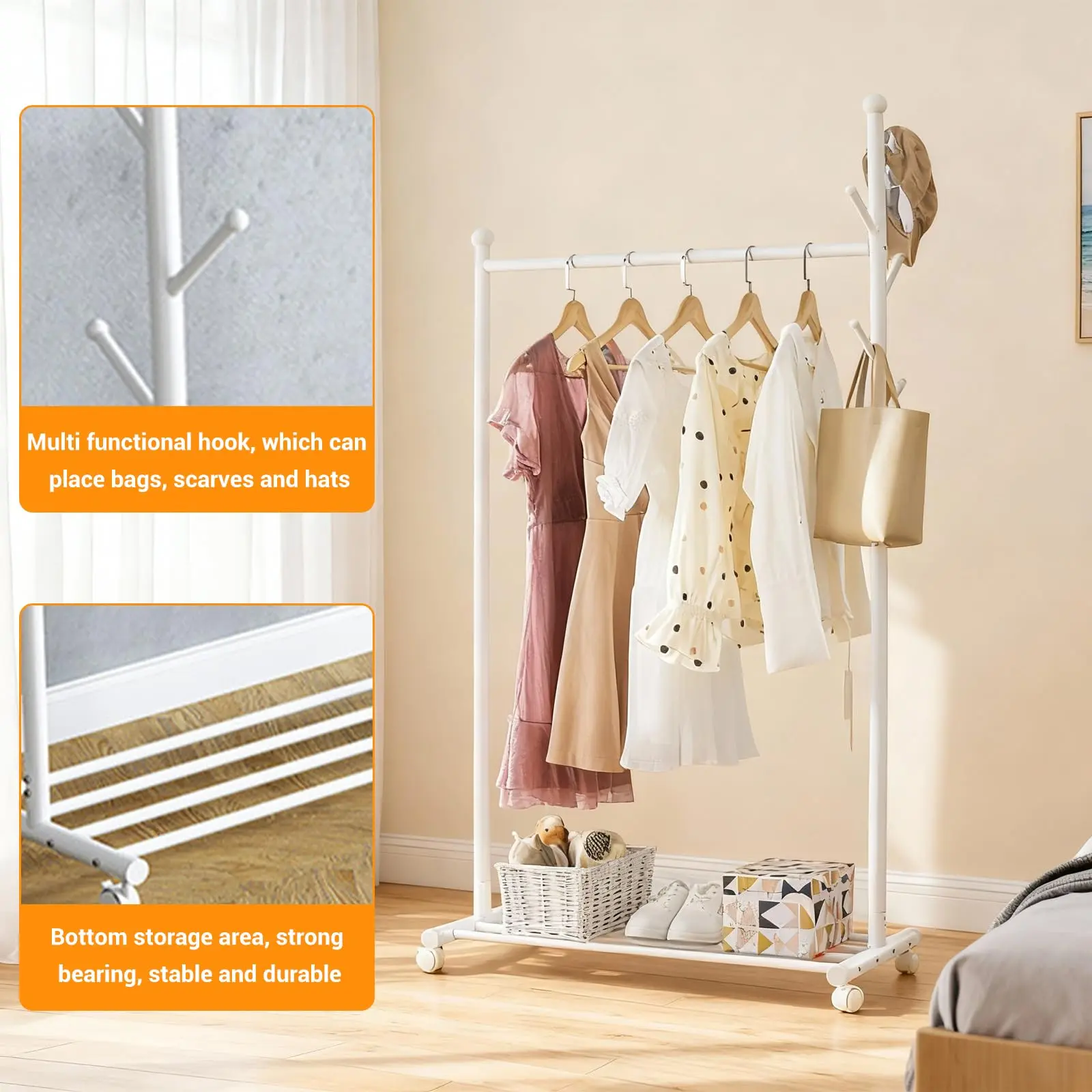 · 【Versatile and Stylish Design】 Our coat rack is comes equipped with a rod for hanging clothes, perfect for organizing your favorite outfits. Additionally, there are hooks to hang hats, bags, scarves, and other accessories, ensuring everything is within easy reach and neatly organized. Perfect for various settings such as bedrooms, laundry rooms, closets, offices, cloakrooms, porches, living rooms, balconies, commercial displays, and more.