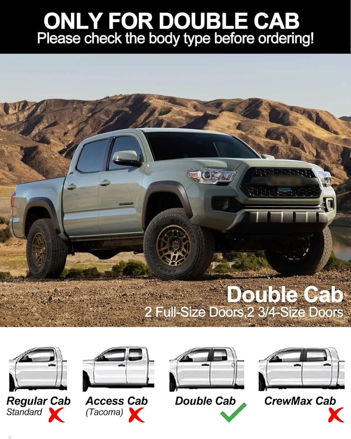· Tailored Fit:Comptabile with Toyota Tacoma Double Cab 2005 2006 2007 2008 2009 2010 2011 2012 2013 2014 2015 2016 2017 2018 2019 2020 2021 2022 2023
