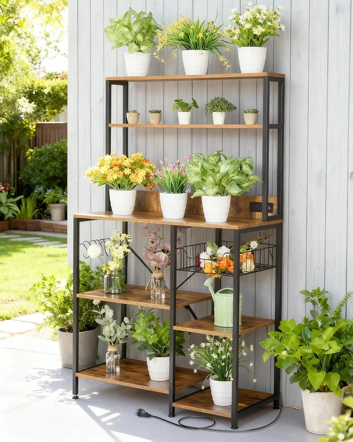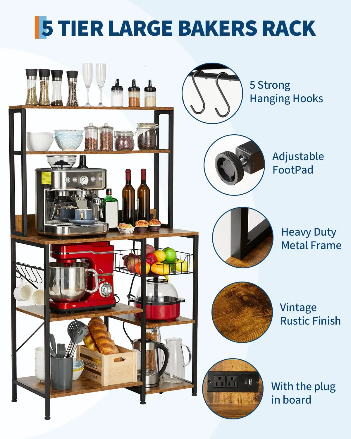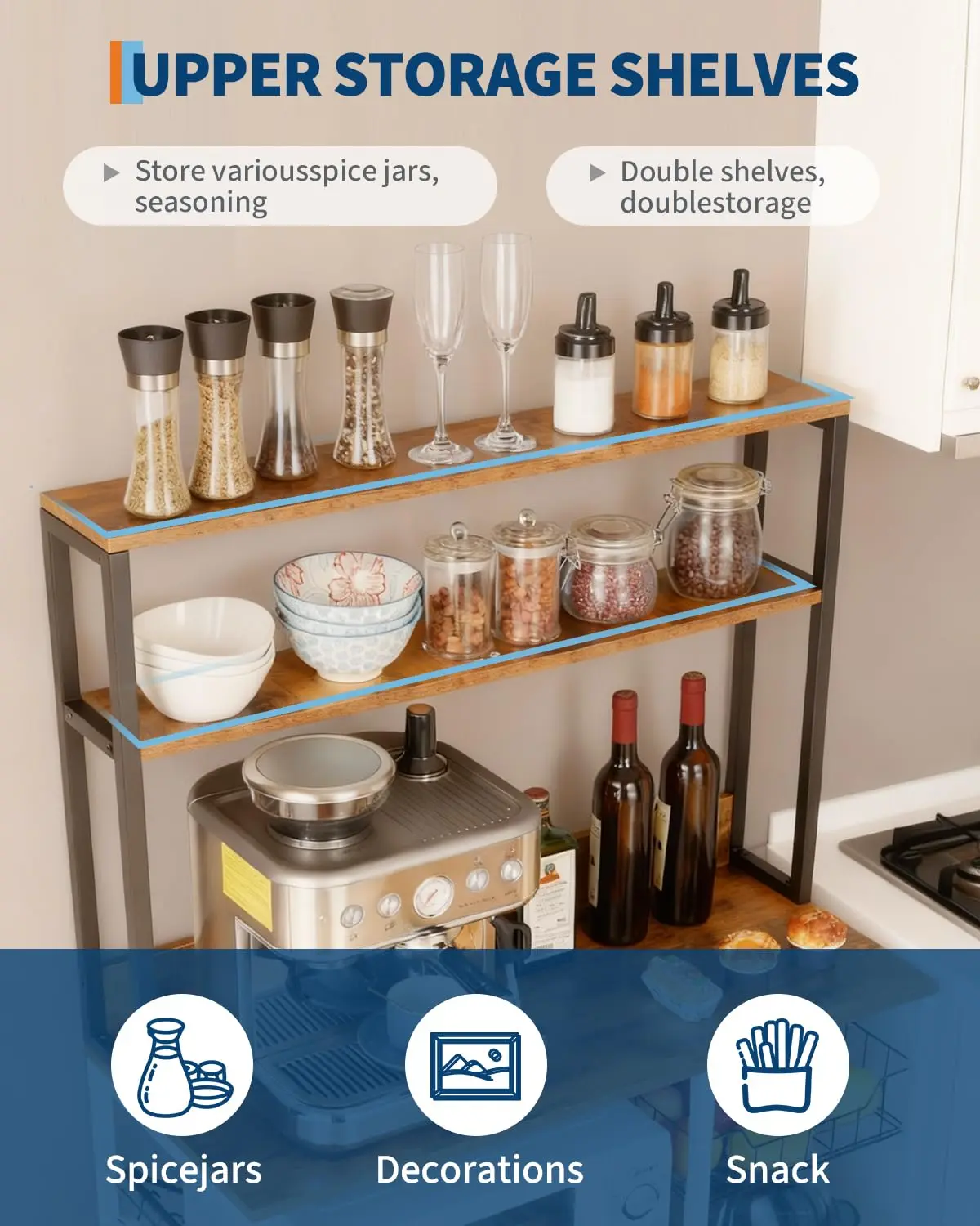 · Convenient Charging with Built-in Power OutletsThis baker’s rack features two integrated power outlets and an air switch, allowing you to easily power kitchen appliances like your coffee maker, microwave, or bread maker—no need to move your setup or search for nearby sockets. Keep your kitchen organized and efficient with a convenient charging station right where you need it.