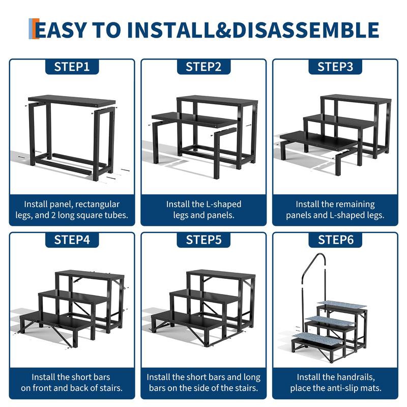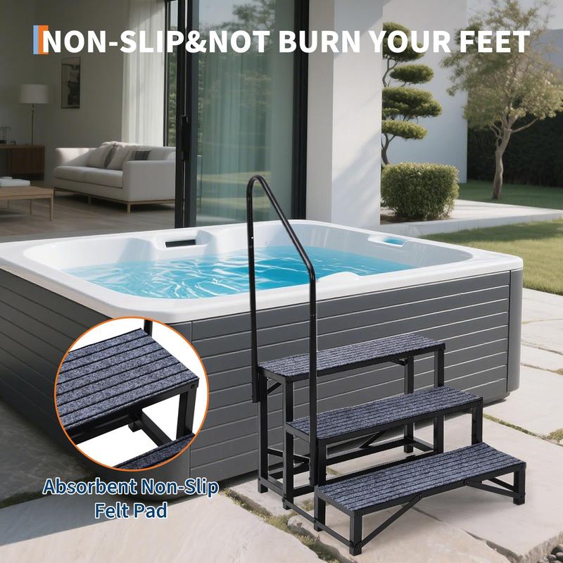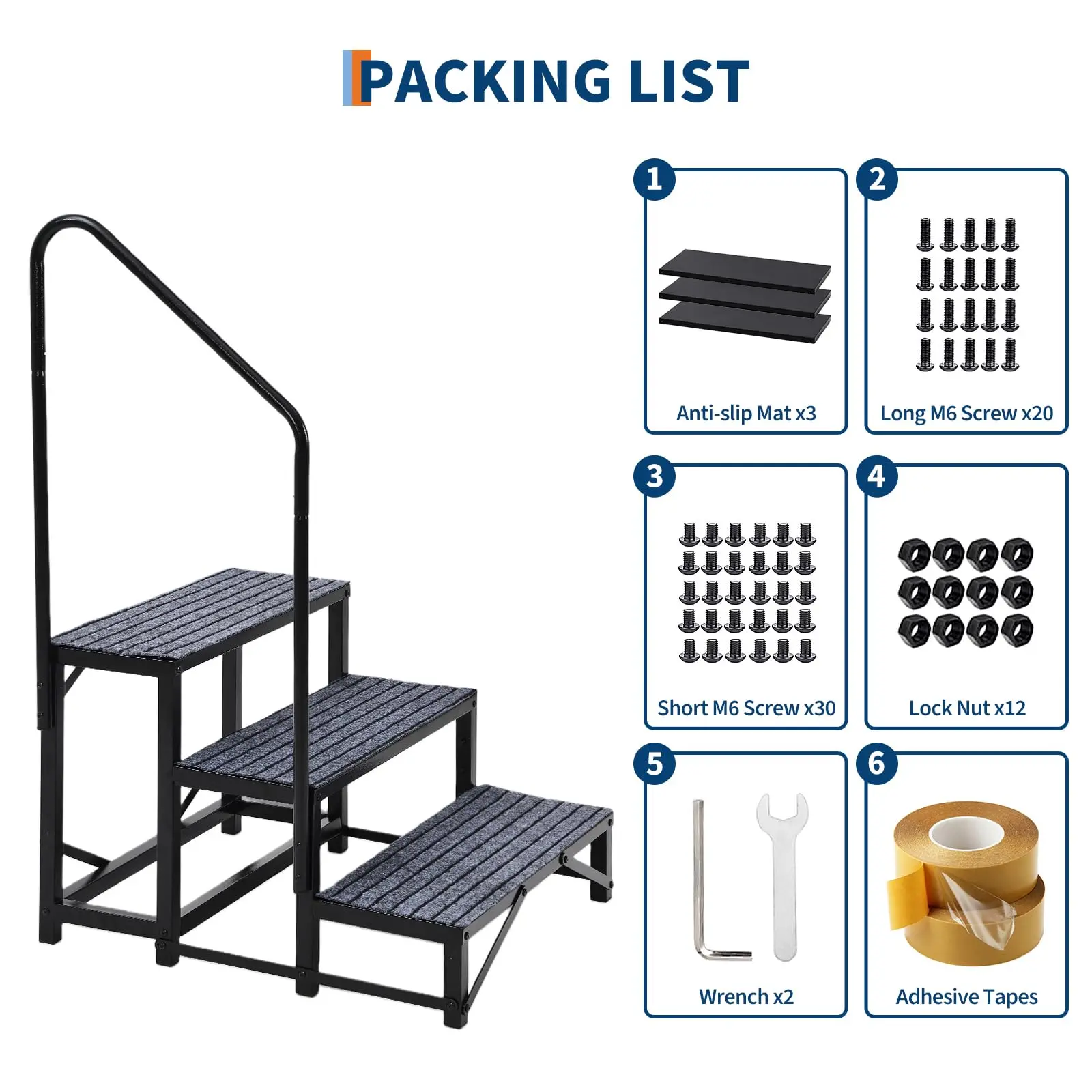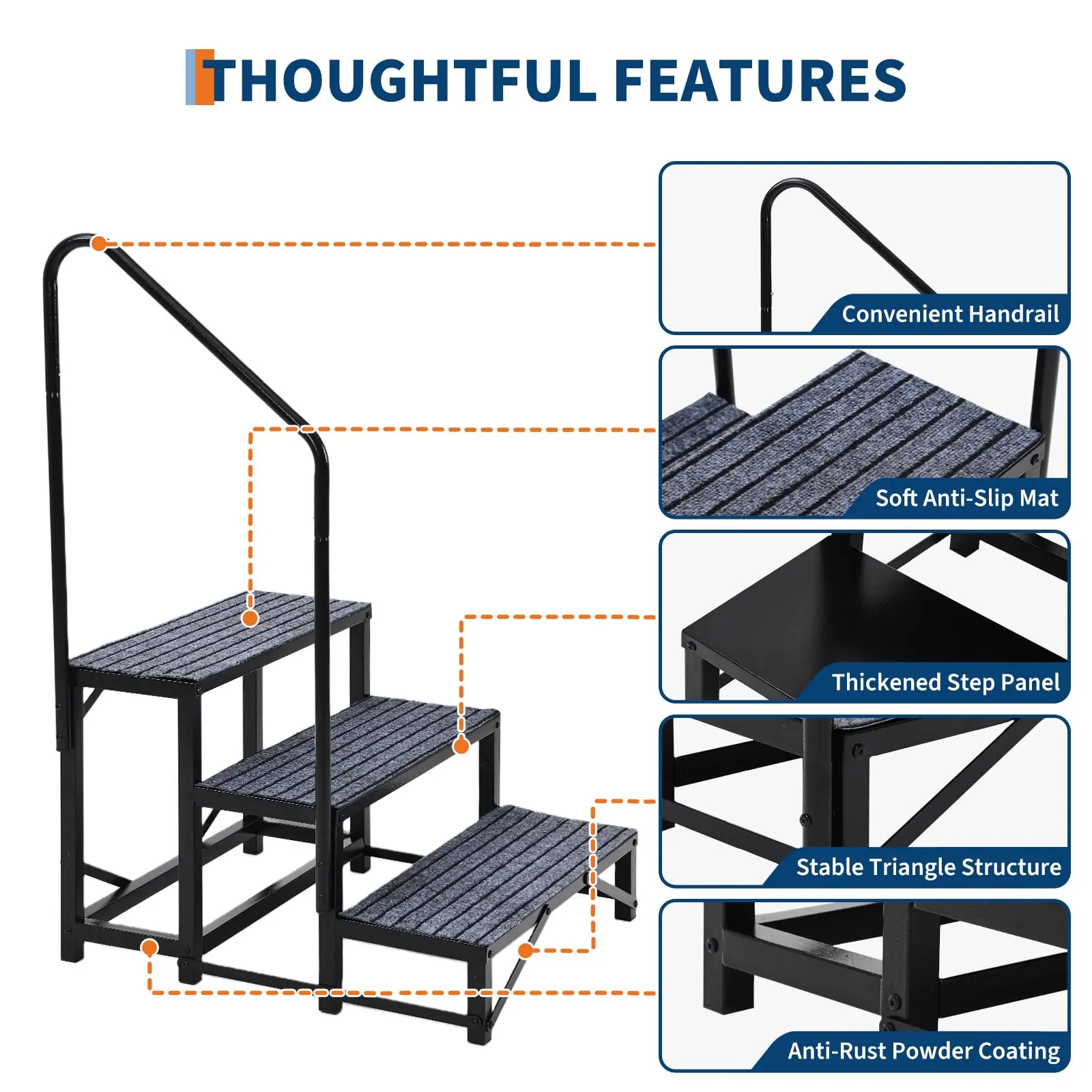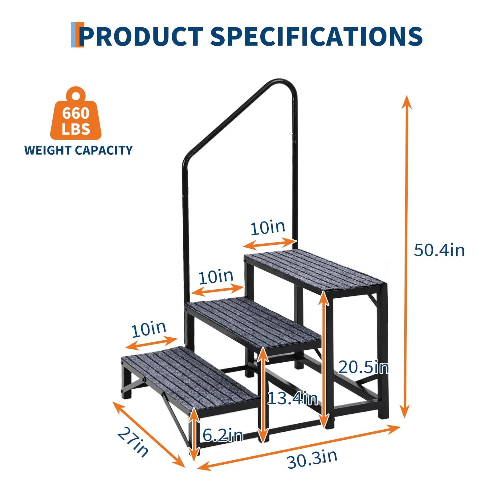 · Enhanced Safety with Secure Handrails & Non-Slip Mats: Feel confident with every step thanks to the sturdy, portable handrails providing reliable support for seniors, children, pets, or anyone needing extra stability. Deep-grooved, slip-resistant mats significantly increase traction, minimizing fall risks for safe access to your RV, hot tub, or trailer, even when wet.
