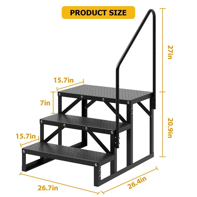 · Sturdy Handrails for Added Safety: Equipped with handrails, these steps provide extra stability when entering or exiting your RV or mobile home. Firmly grasping the handrail enhances balance and reduces the likelihood of slipping, ensuring a safer experience for you and your family.