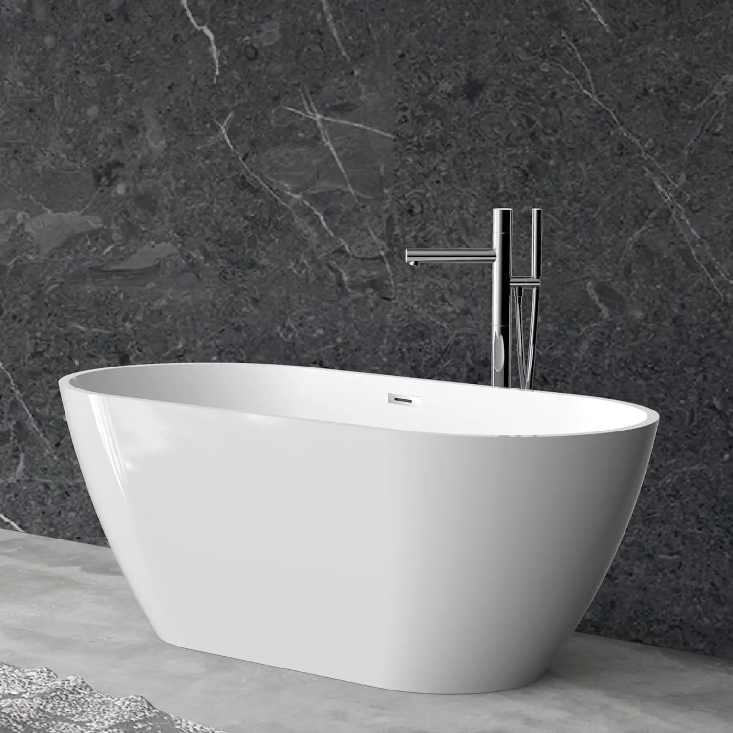 Garvee Spacious Acrylic Freestanding Bathtub – Deep Soaking Stand Alone Tub with Chrome Overflow & Drain – Glossy White, Modern Design – Flora Acrylic Freestanding Bathtub with Chrome Drain