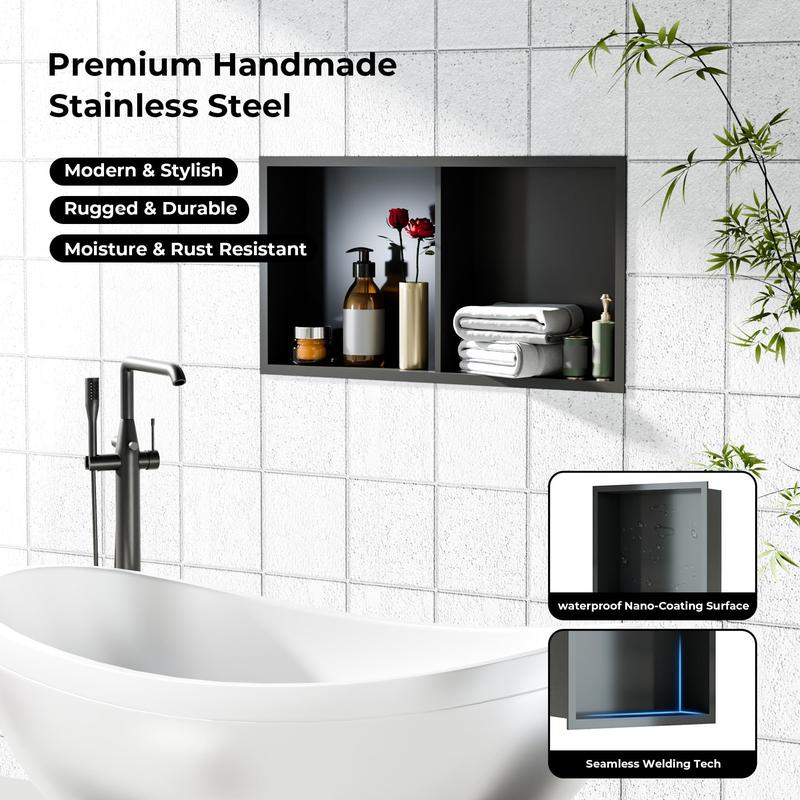 · Material: Made from premium stainless steel, this shower niche boasts long-lasting durability; its waterproof coated resists moisture, rust, scratches, and wear, ensuring a sleek, modern finish that enhances your bathroom' s aesthetic