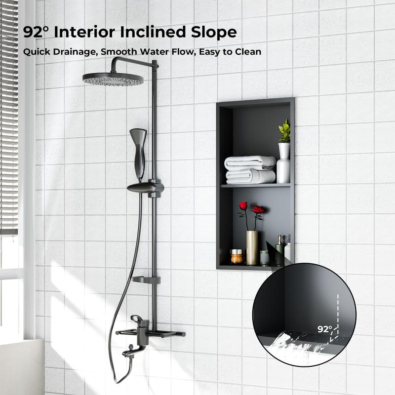 · Thoughtful Drainage Design: With a 92° interior slope for optimal drainage, this shower niche promotes smooth water flow to prevent accumulation; its design enhances your shower experience and simplifies cleaning for a hygienic bathroom.