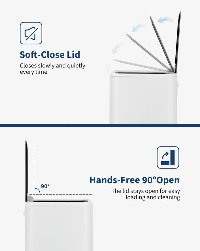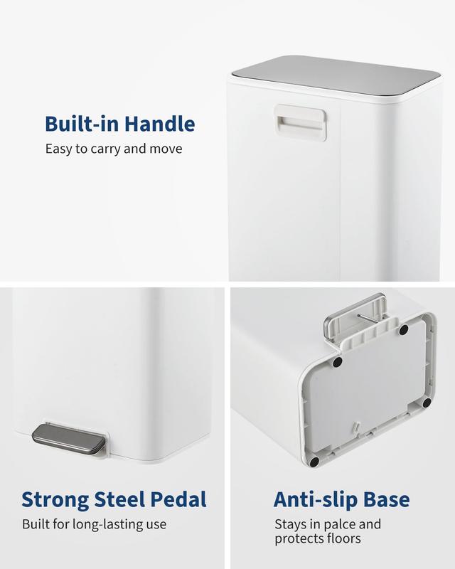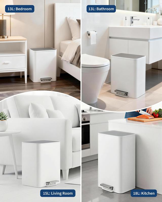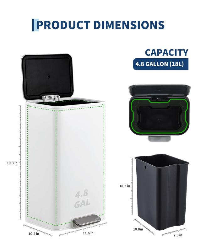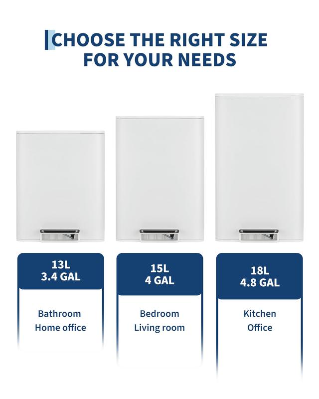 · Soft-close lid & foot pedal: Step trash can features a reliable foot pedal for hands-free opening and a quiet soft-close lid that prevents slamming, reduces noise and helps trap odors; ideal garbage bin for homes with kids, pets or shared office environments