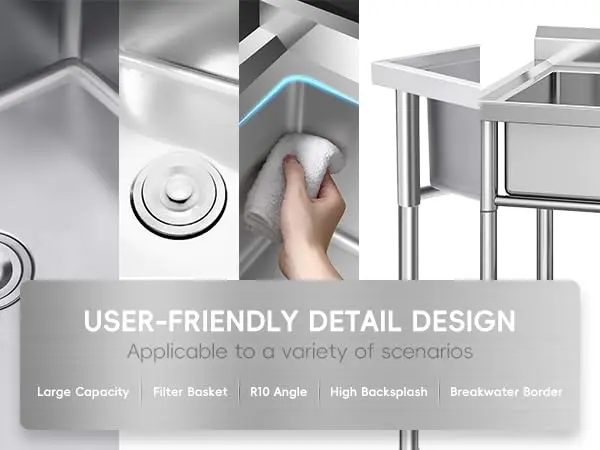· 【Anti-Splash Backsplash & Raised Edges】 Designed for cleaner workspaces, this commercial kitchen sink includes a 4" backsplash and raised perimeter edges to reduce water splashes—ideal for restaurant kitchens, workshops, and utility areas.