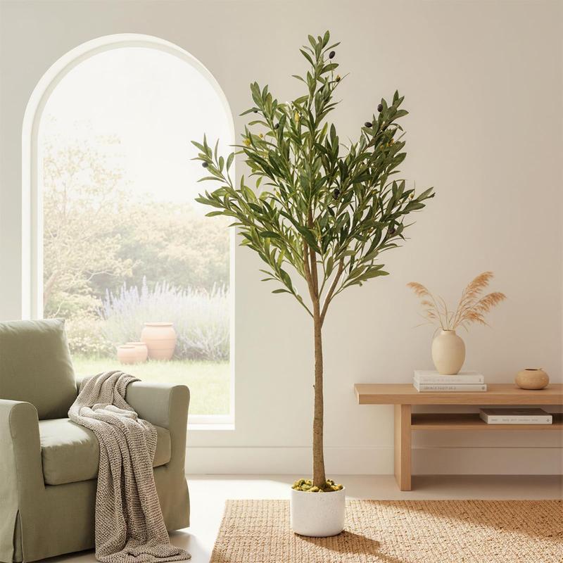 · 【ELEGANT FAUX OLIVE TREE】A statement piece for any room, this tall artificial olive tree stands with remarkably realistic branches and fruit. Its sophisticated design complements modern home aesthetics, providing a cozy and stylish upgrade to your living space.