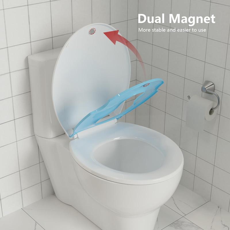 · [Built-In Potty Trainer]: 2 in-1 design combines a standard adult toilet seat and a toddler toilet seat in one seamless unit, letting kids transition confidently without extra potty chairs; the child ring nests magnetically inside the lid when not in use for a clutter-free bathroom.