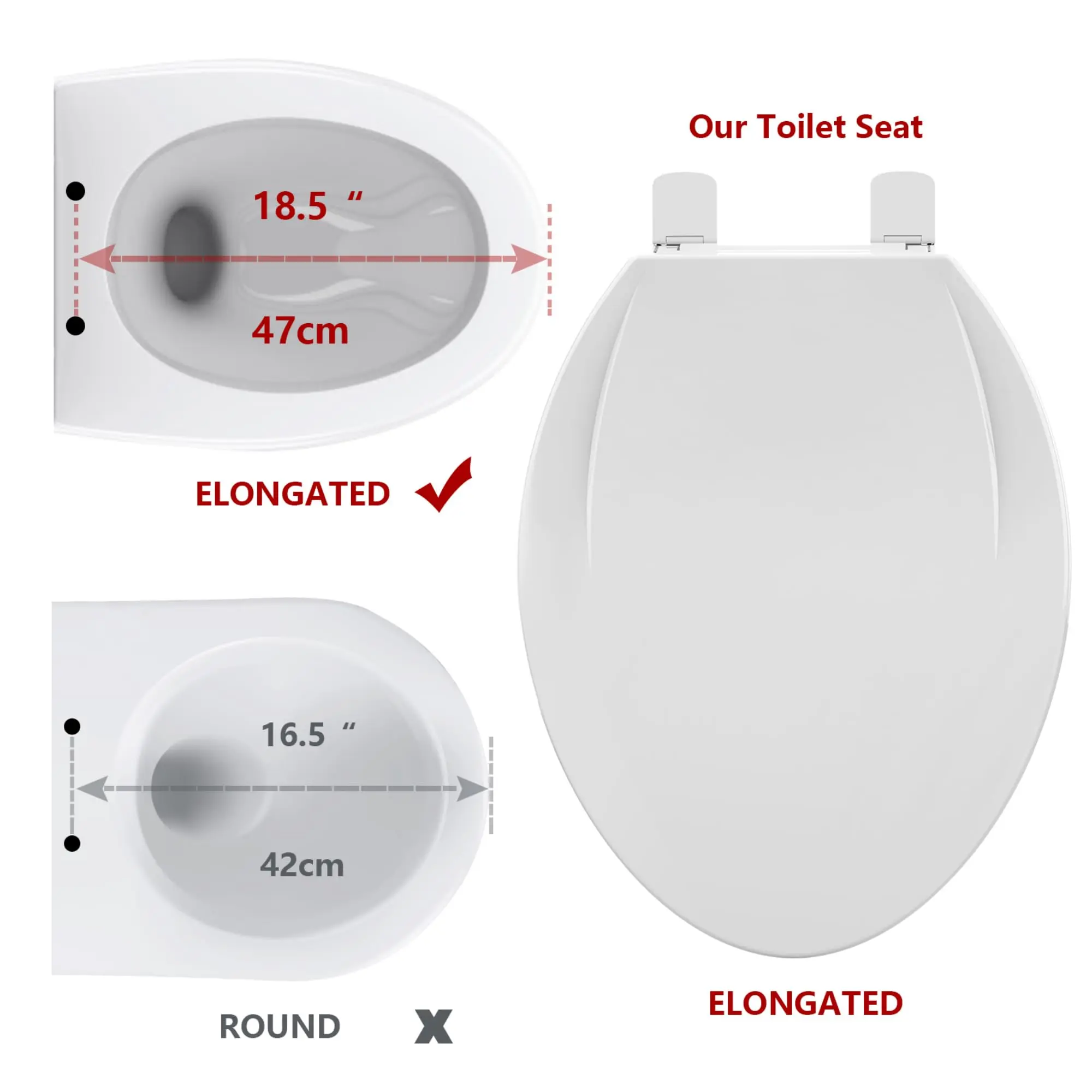 · 【Size: Round】- This is an Elongated toilet seat. it's suitable for most standard Elongated toilet bowls; Please measure your toilet before ordering.