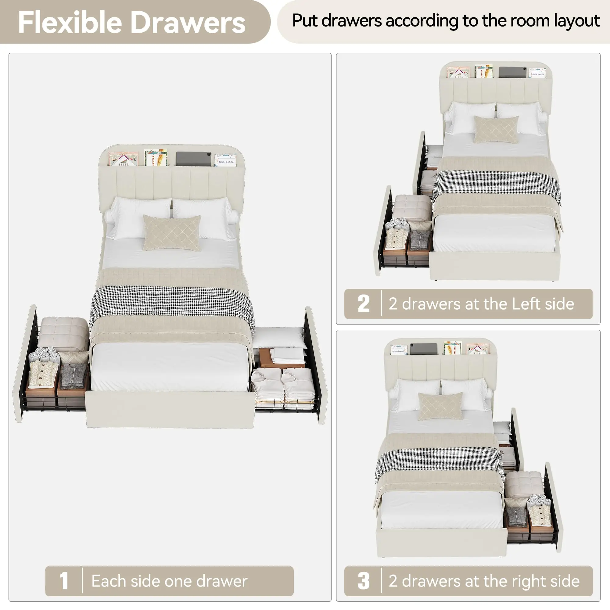 · --Effortless Organization: This twin bed includes 2 roomy drawers that can be positioned in any of the four locations underneath, offering flexible storage solutions tailored to your space. Ideal for neatly organizing clothes, toys, or extra bedding, it maximizes room efficiency in smaller bedrooms