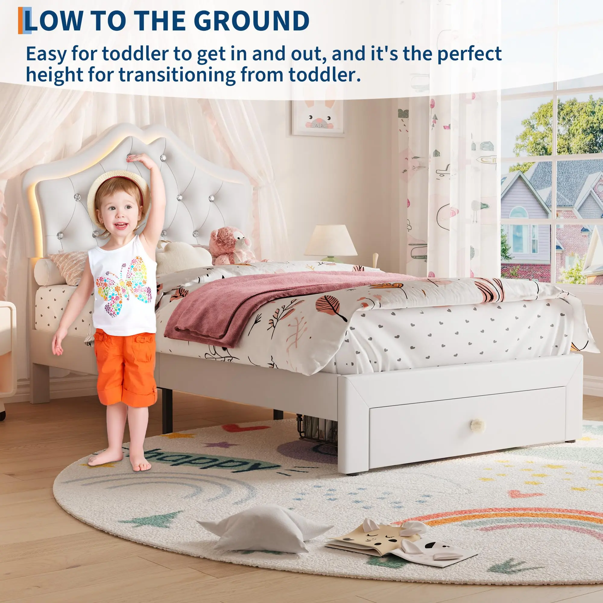· Perfect for Kids and Teens: This twin size upholstered platform bed is designed with both practicality and comfort in mind. With its LED headboard, storage drawer, and noise free construction, it offers a functional yet stylish solution tailored for kids' and teens' bedrooms.