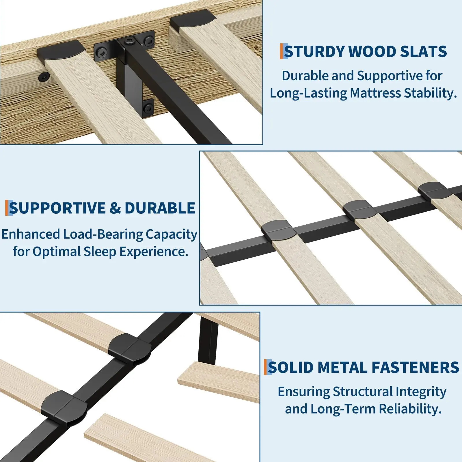 · 🛏️ Sturdy Platform Base with Reinforced Slats–No Box Spring Needed–Built with a stable engineered wood frame and strong slat support system that works with all standard mattress types (foam, hybrid, innerspring).