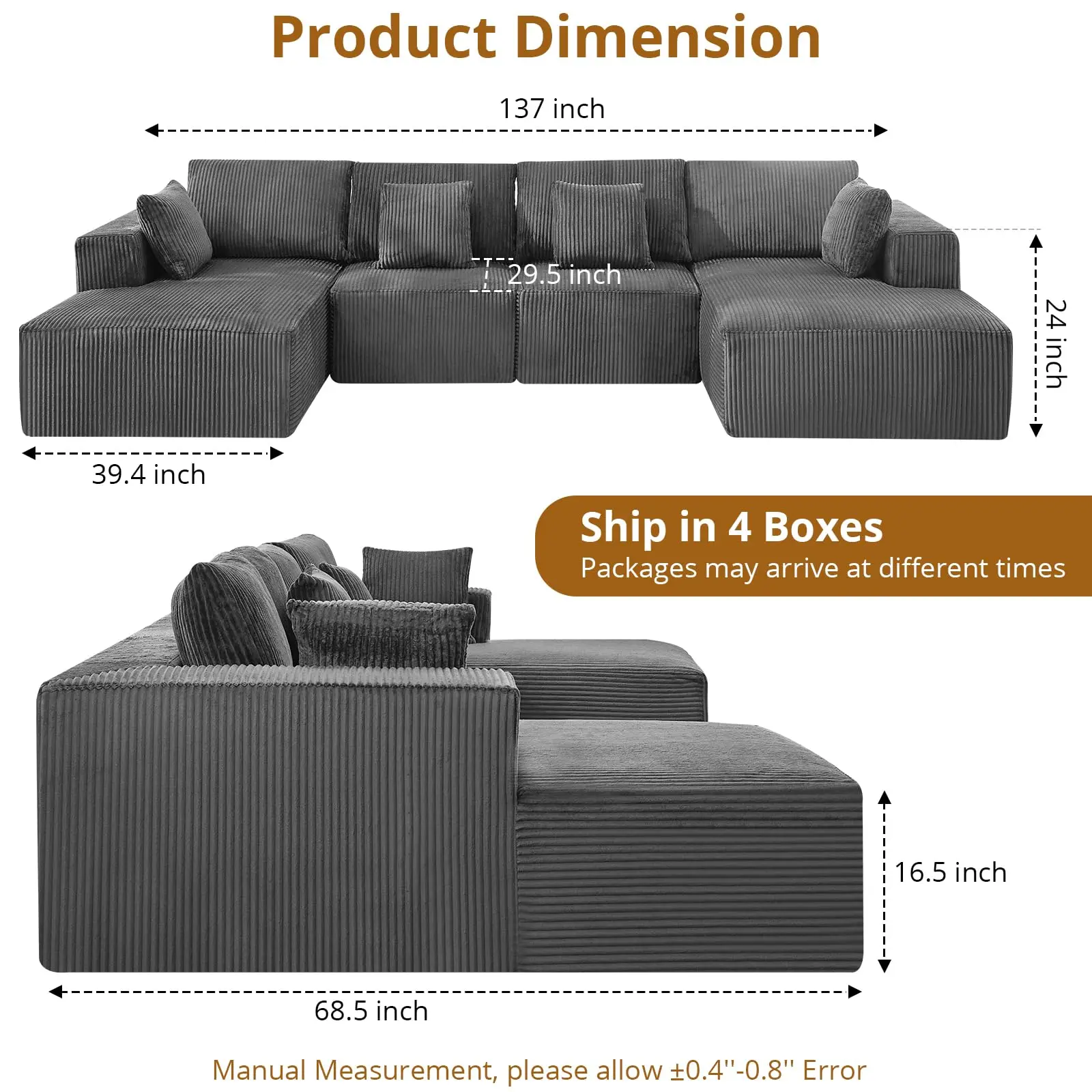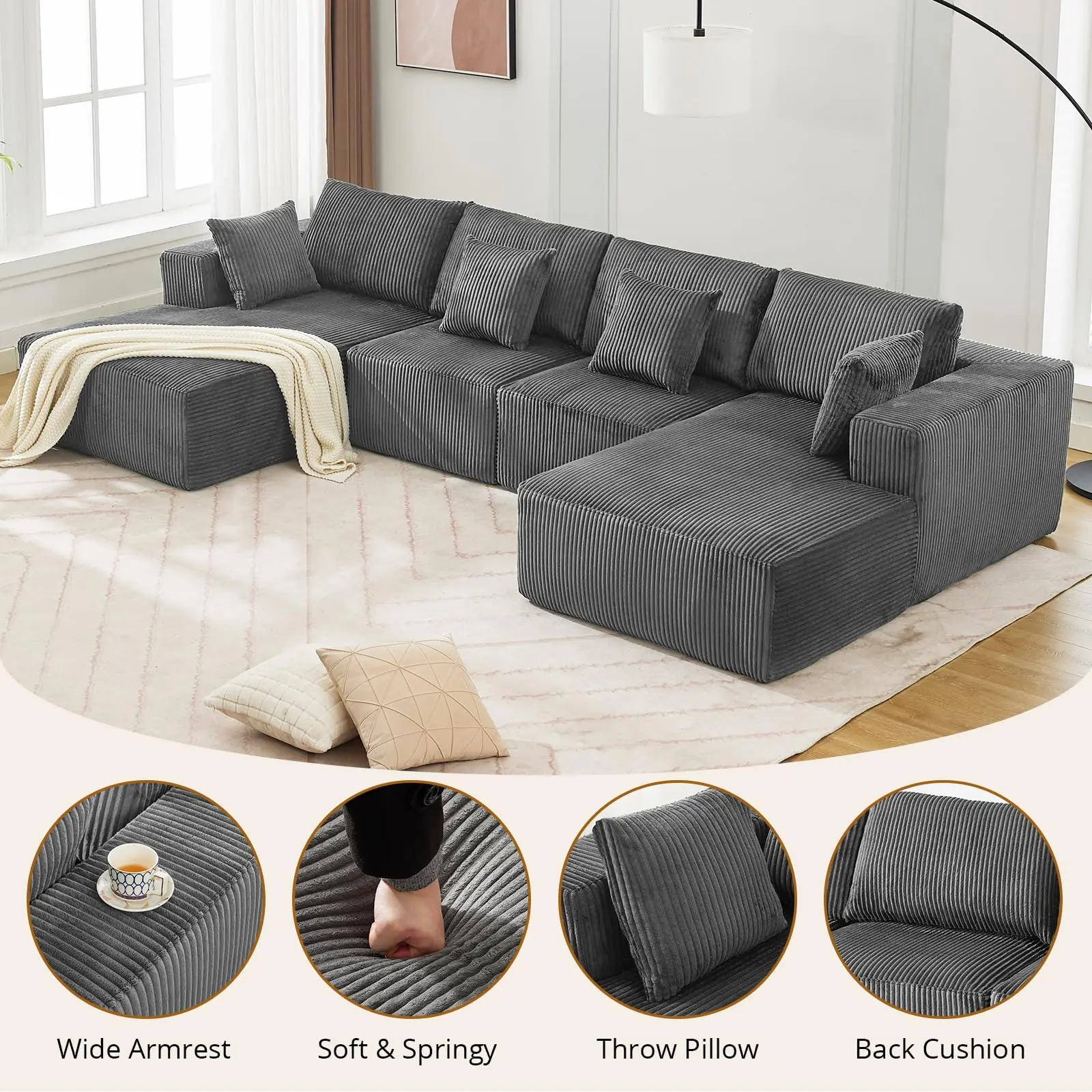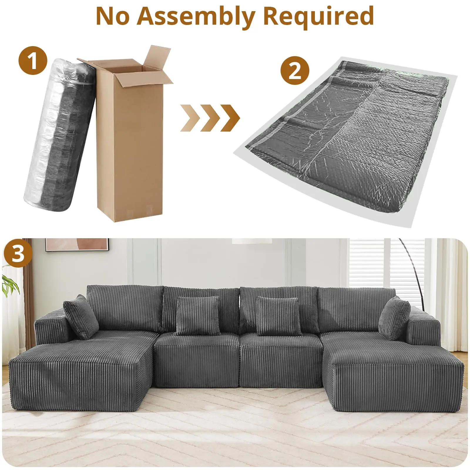 · No Assembly Required: This sectional Couch comes in a compressed packaging design, which is convenient for those who don't want complicated furniture assembly. No tools are required, and it's hassle-free - just open the vacuum-sealed packaging and it easily unfolds into a soft and comfortable U-shaped sofa.
