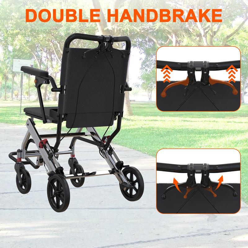 · 【Prioritizing Safety】Safety is paramount in our portable wheelchair, evidenced by the inclusion of advanced safety features that enhance control and security. The wheelchair is equipped with a responsive double hand brake system, allowing you to navigate with confidence. Additionally, the automatic brake catch effectively locks the handbrake when engaged, providing an extra layer of security as you move through various environments.