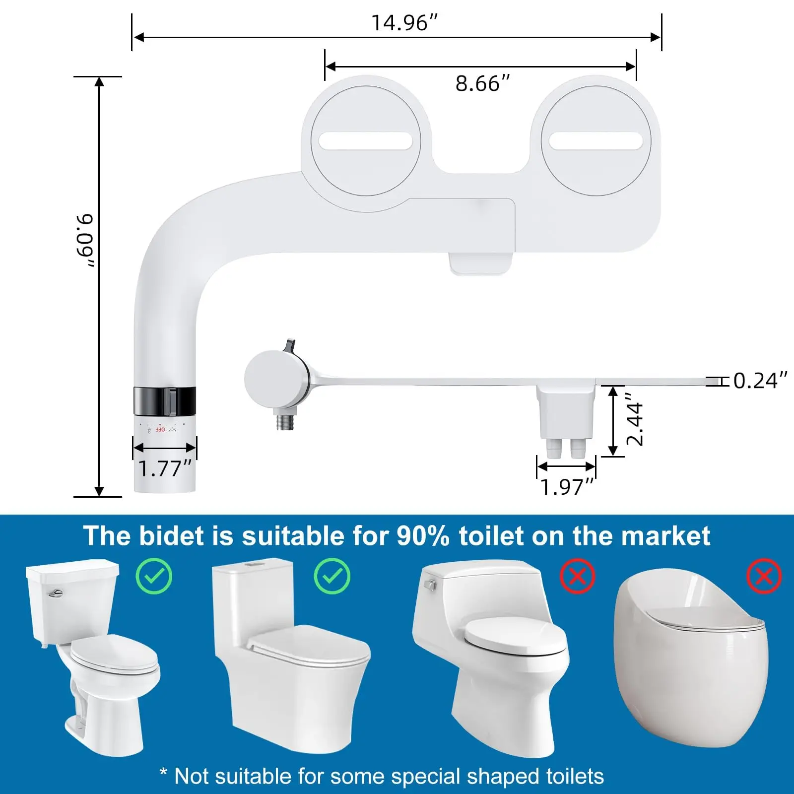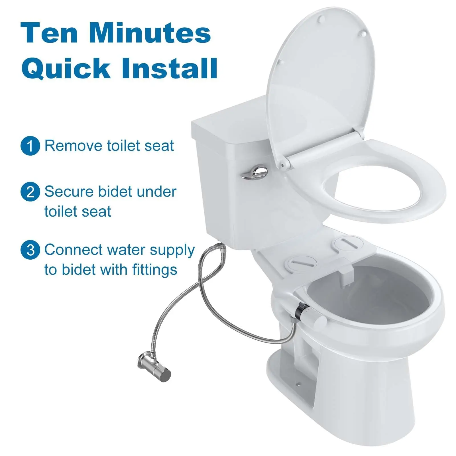 · Designed for tool-free, no-plumbing installation, this non-electric bidet retrofits any standard two-hole toilet seat hinge without drilling or wiring. The included stainless steel T-valve, braided metal hose, and mounting hardware enable setup in under 10 minutes, requiring no professional assistance.
