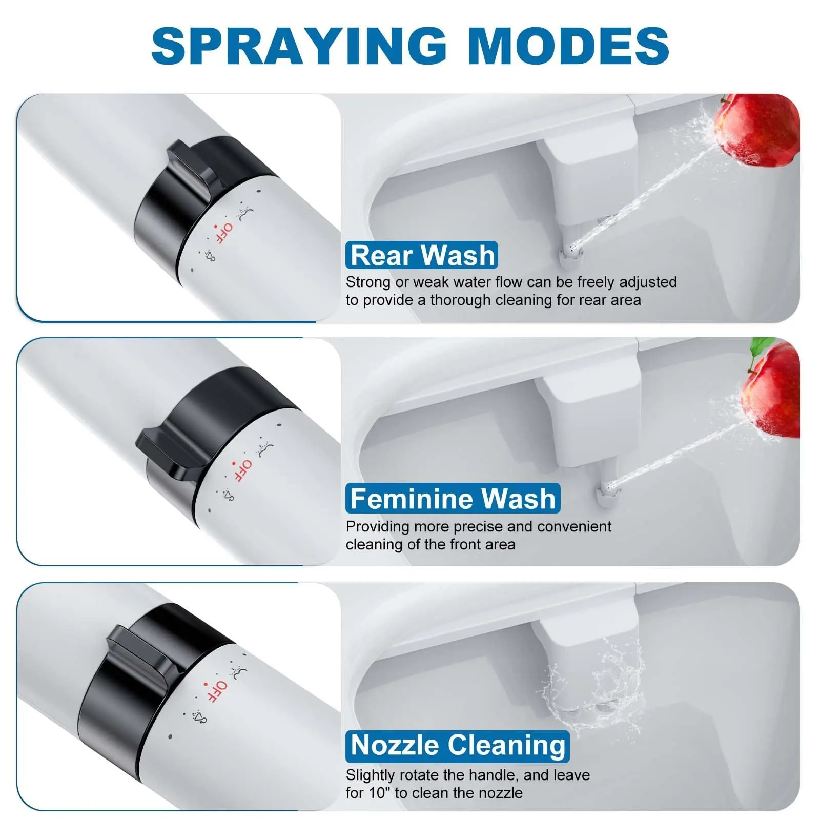 · Featuring two extendable and adjustable nozzles, this bidet attachment offers dedicated spray modes—a powerful posterior rinse and an angled gentle feminine wash. The nozzles pivot to reach every contour, providing a thorough, spa-like clean suitable for daily hygiene, menstrual care, pregnancy, or postpartum comfort.