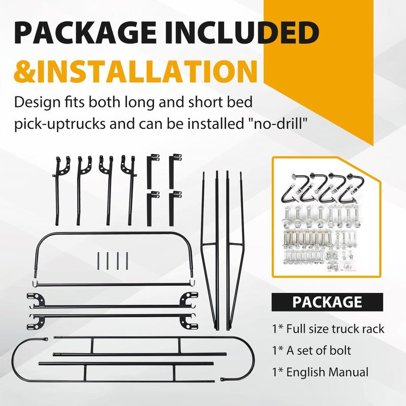 · EASY INSTALLATION: No drilling required—this Truck Rack installs quickly without damaging your truck’s side rails. For a more permanent setup, pre-drilled holes on the mounting brackets allow for optional bolt-on installation