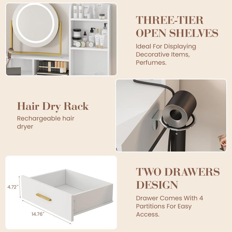 · 360° Rotatable Mirror with 3-Mode LED Lighting: Engineered for precision, this makeup vanity includes a 360° swivel mirror and an intuitive touch-control panel. Choose 3 modes from warm, cool, and natural while easily adjusting brightness—helping you achieve a perfect look with this versatile makeup vanity desk with lights.